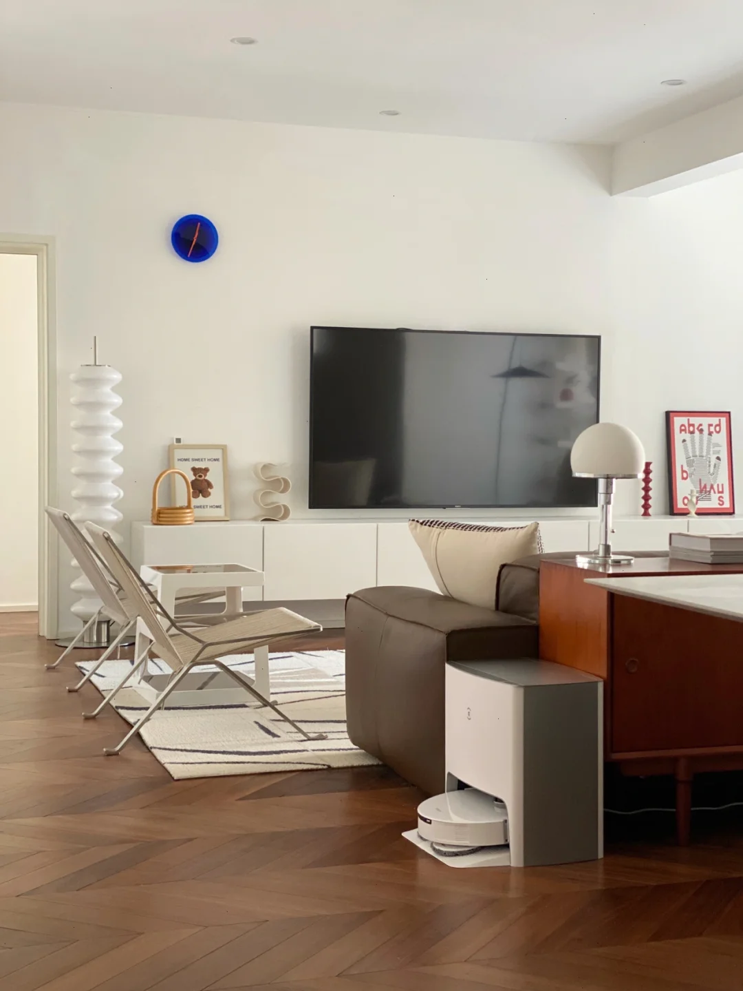 5⃣️电视柜上墙隐藏插座、ap面板,没有密密麻麻的“蜘蛛网”,看起来超清爽,下面没有卫生死角,拖地方便