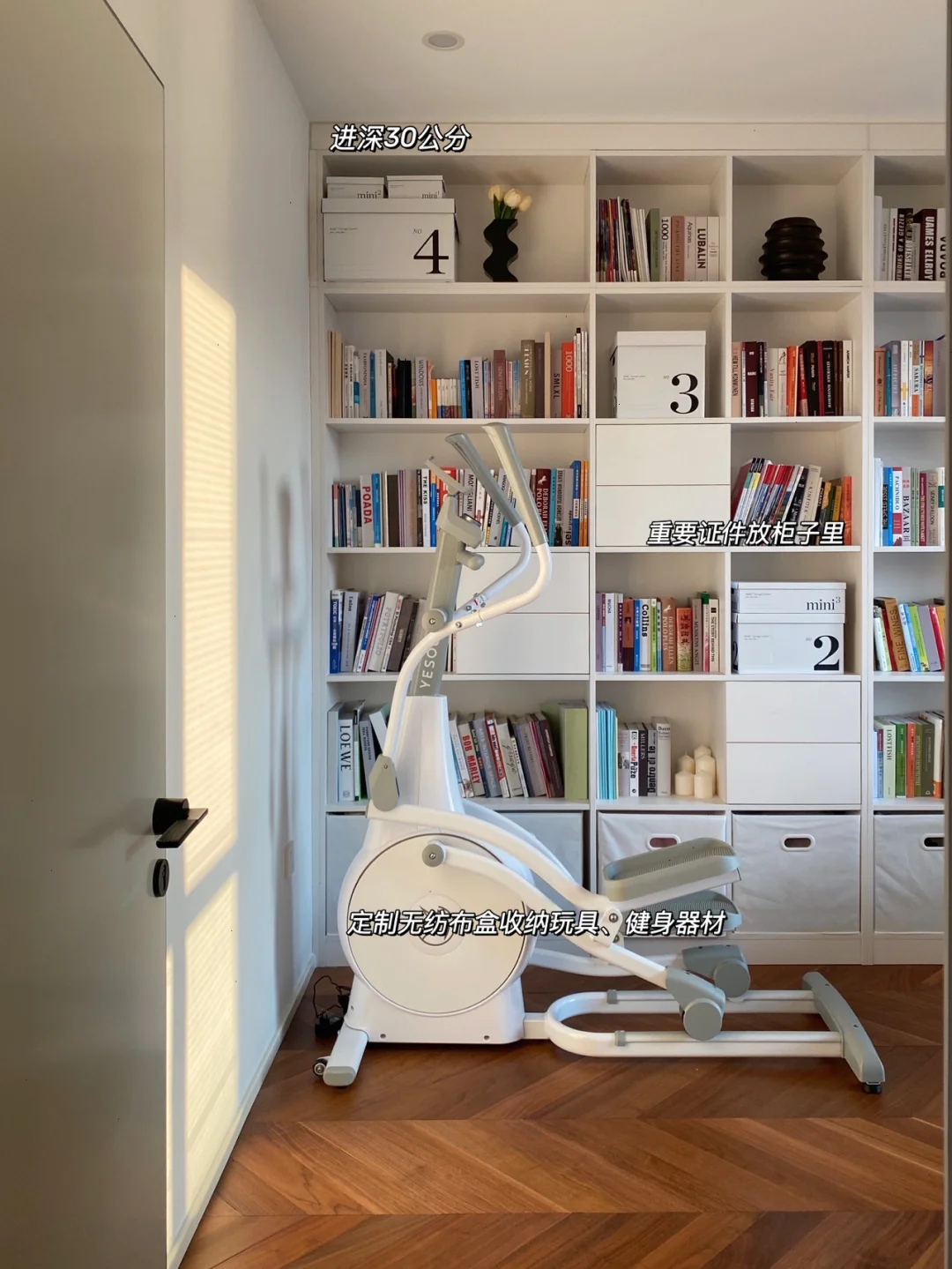 1⃣️1⃣️半开放式书墙,以后宝宝再多的绘本都有地儿放,玩具可以教他自己玩完收纳在最下面一排的无纺布收纳盒里,看起来像抽屉的几个小柜子收纳零散文件