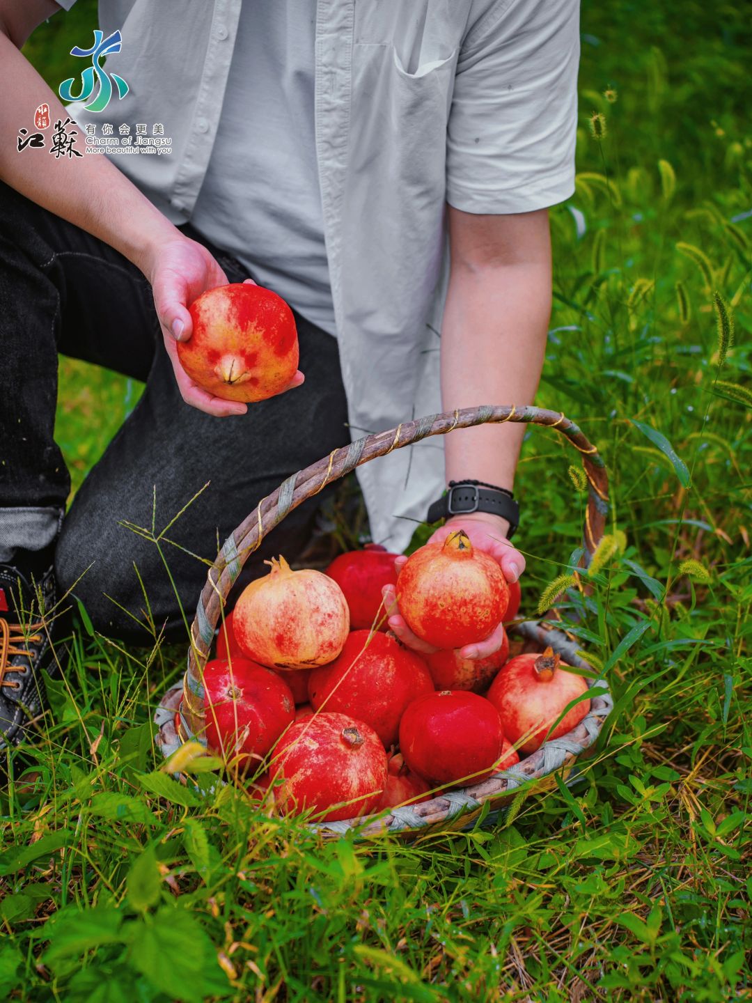 手提竹篮,走在石榴树之间,亲手采摘好快乐~
