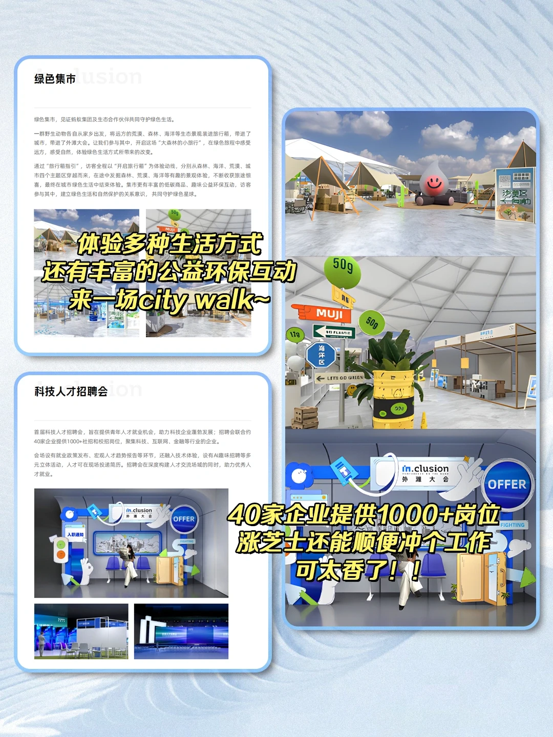 体验植物、动物、海洋、城市四大主题的生活方式,还有丰富的低碳商品、趣味公益环保互动,在外滩大会来一场city walk[得意R]