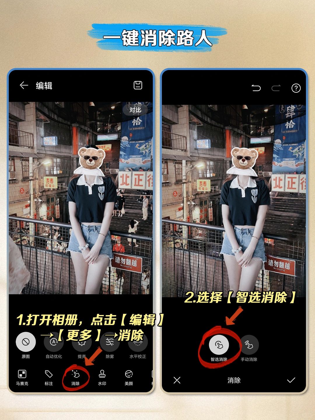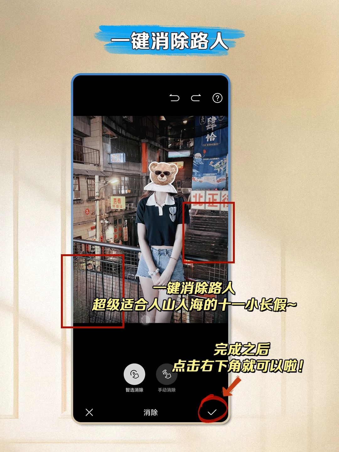 好不容易摆了美美的pose,结果后面好多路人甲…也不用怕他们打扰你的美貌,可以一键消除路人,超级适合人山人海的十一小长假~