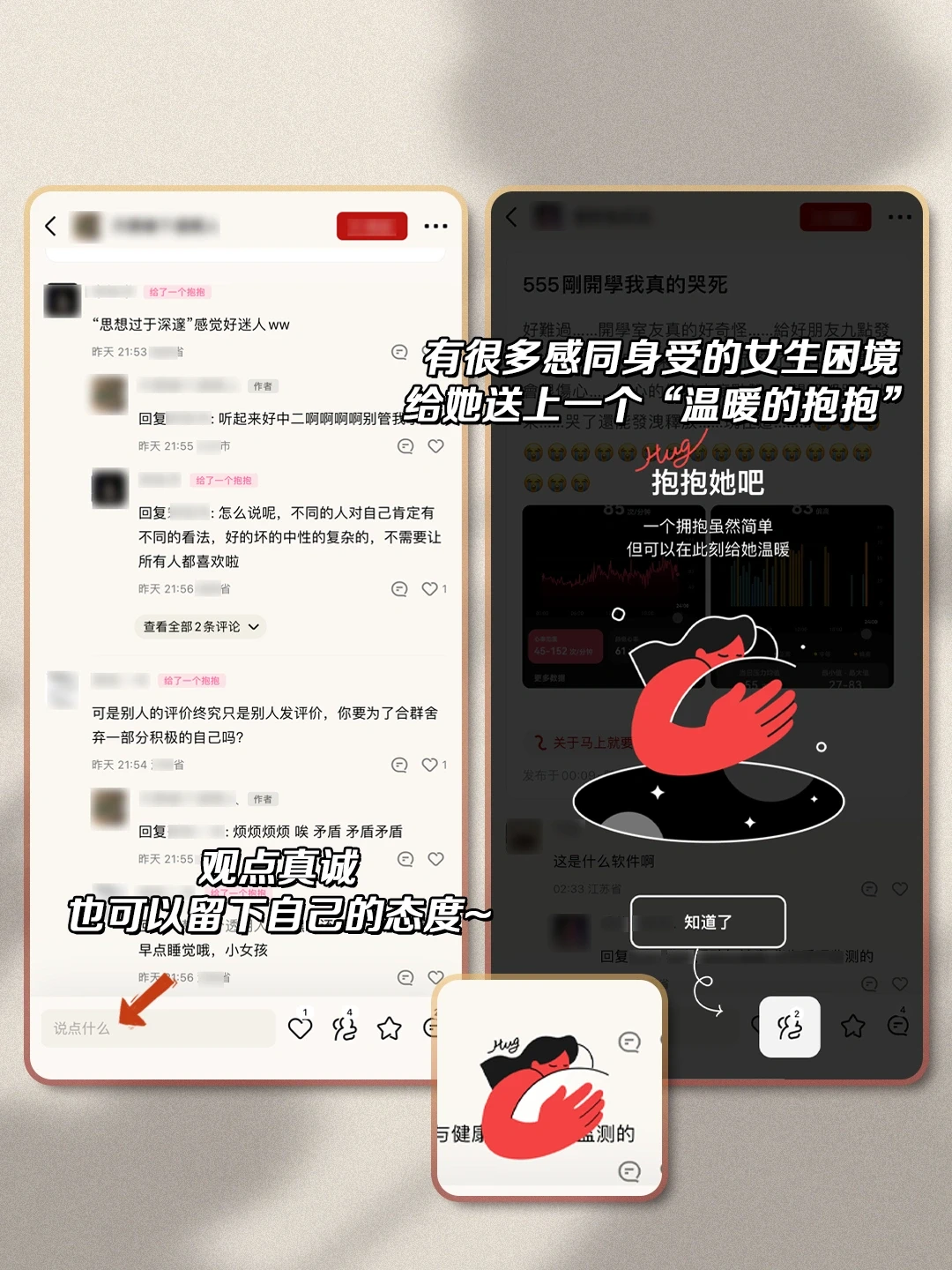 [种草R]可以感受认同。有很多真实存在的女生困境,给她送上一个“温暖的抱抱”,希望所有女性可以解脱枷锁,为自己而活!