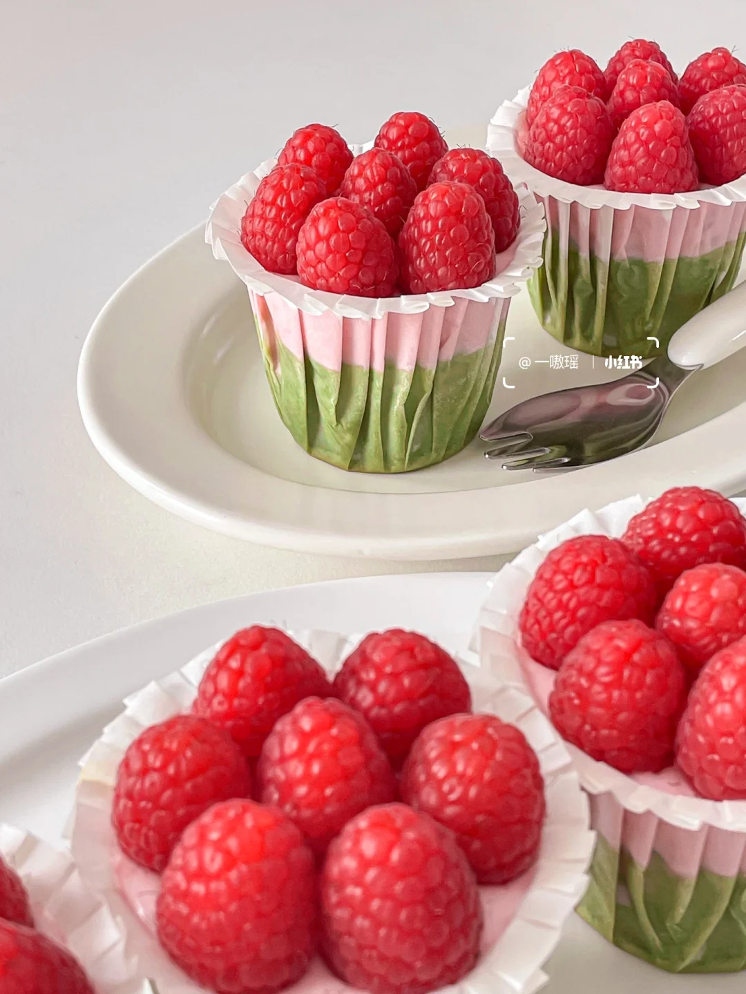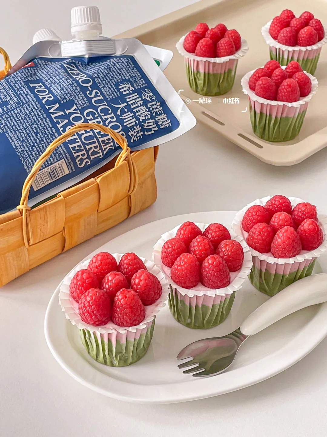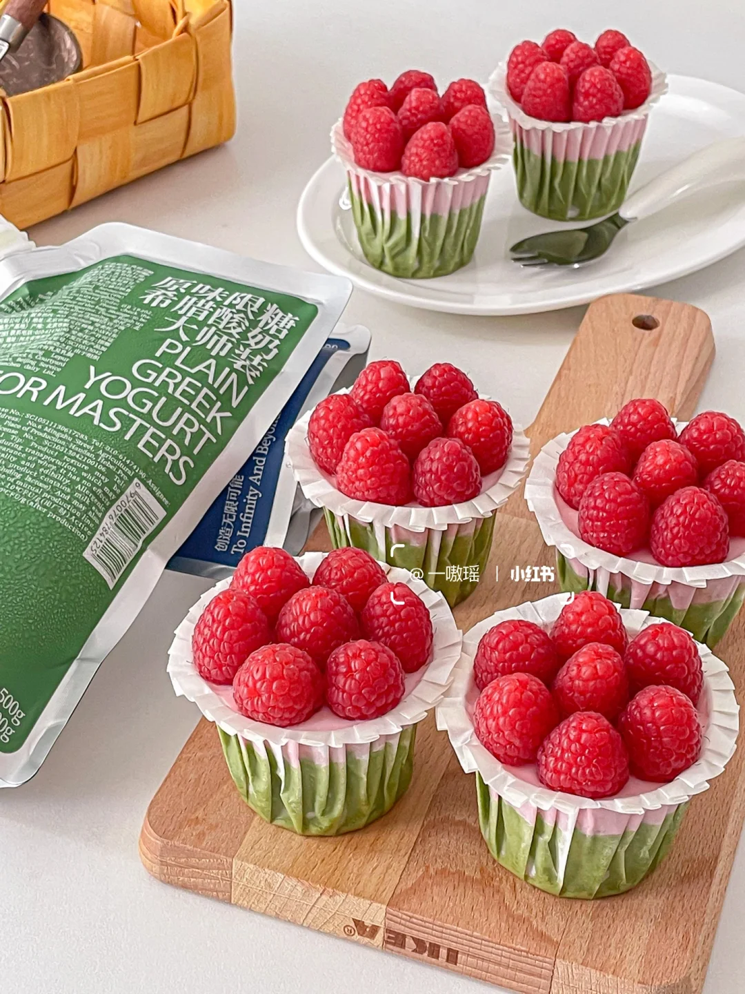 ▫️树莓酸奶分别倒进6个纸杯,放冰箱冷藏1小时至凝固