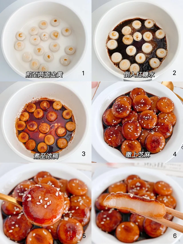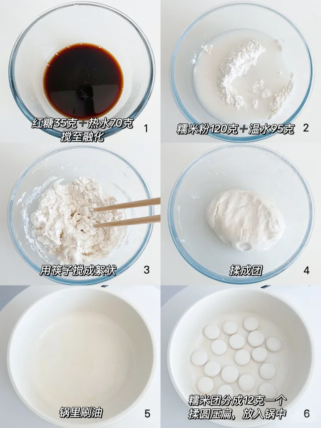 平底锅就能搞定的红糖糍粑,简单快手 糯叽叽 ,好吃到停不下来😋 一起来试试吧~ - 🌿食材: 糯米粉120克,温水95克,红糖35克,热水70克(融化红糖用),熟芝麻适量 - 🌿做法: 1️⃣红糖+热水搅至融化,备用 2️⃣糯米粉+温水,用筷子搅成絮状,揉成团 3️⃣锅里刷油,糯米团分成12克一个,揉圆压扁,放入锅中 4️⃣煎至2面金黄,倒入红糖水,煮至浓稠,撒熟芝麻即可 - 👉tips: 不同糯米粉吸水性不同,温水量可以少量多次加