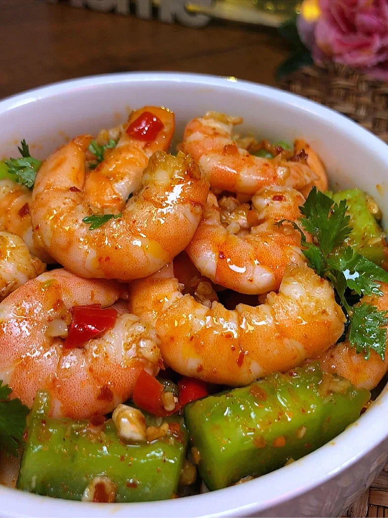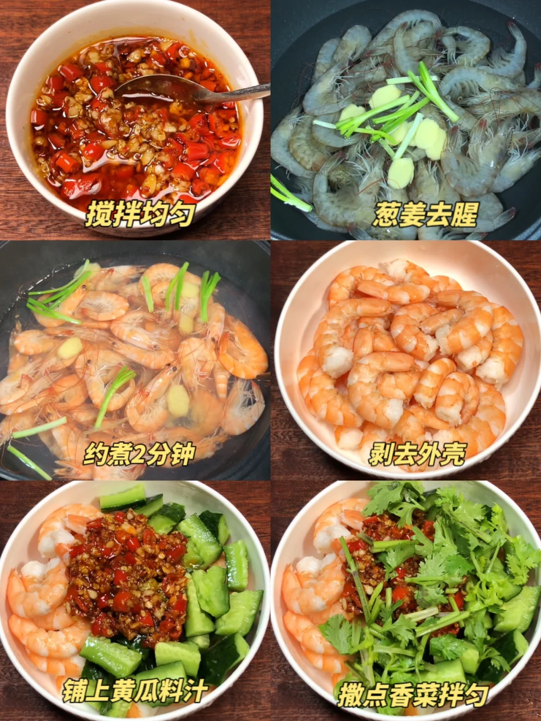 2️⃣锅中水开倒入大虾,加点葱姜去腥,大约煮2分钟即可捞出,冷却后剥去外壳,加点黄瓜,淋上料汁撒点香菜拌匀即可