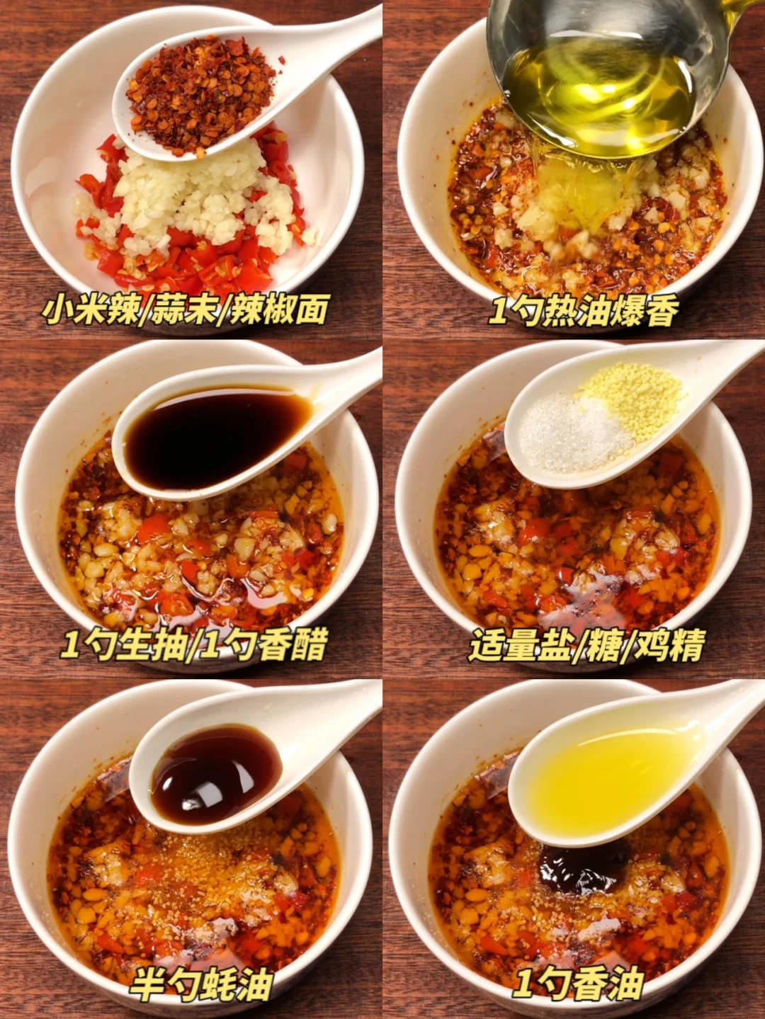 🌿🌿做法:1️⃣碗中准备小米辣,蒜末 辣椒面各一勺,1勺热油爆香,静置10分钟产生红油,加1勺生抽➕1勺香醋➕1勺香油➕半勺蚝油➕适量盐和白糖鸡精调味,搅拌均匀备用