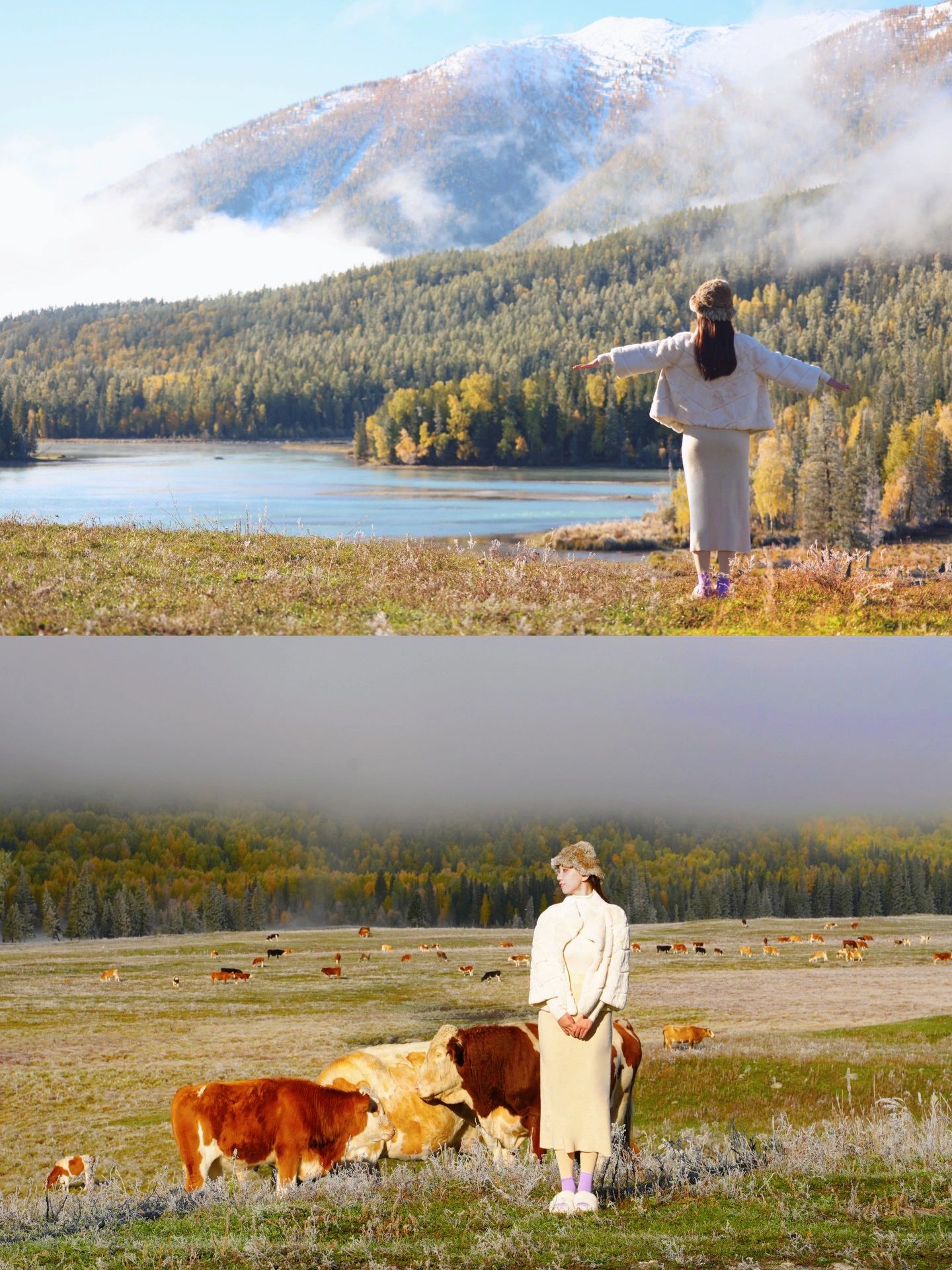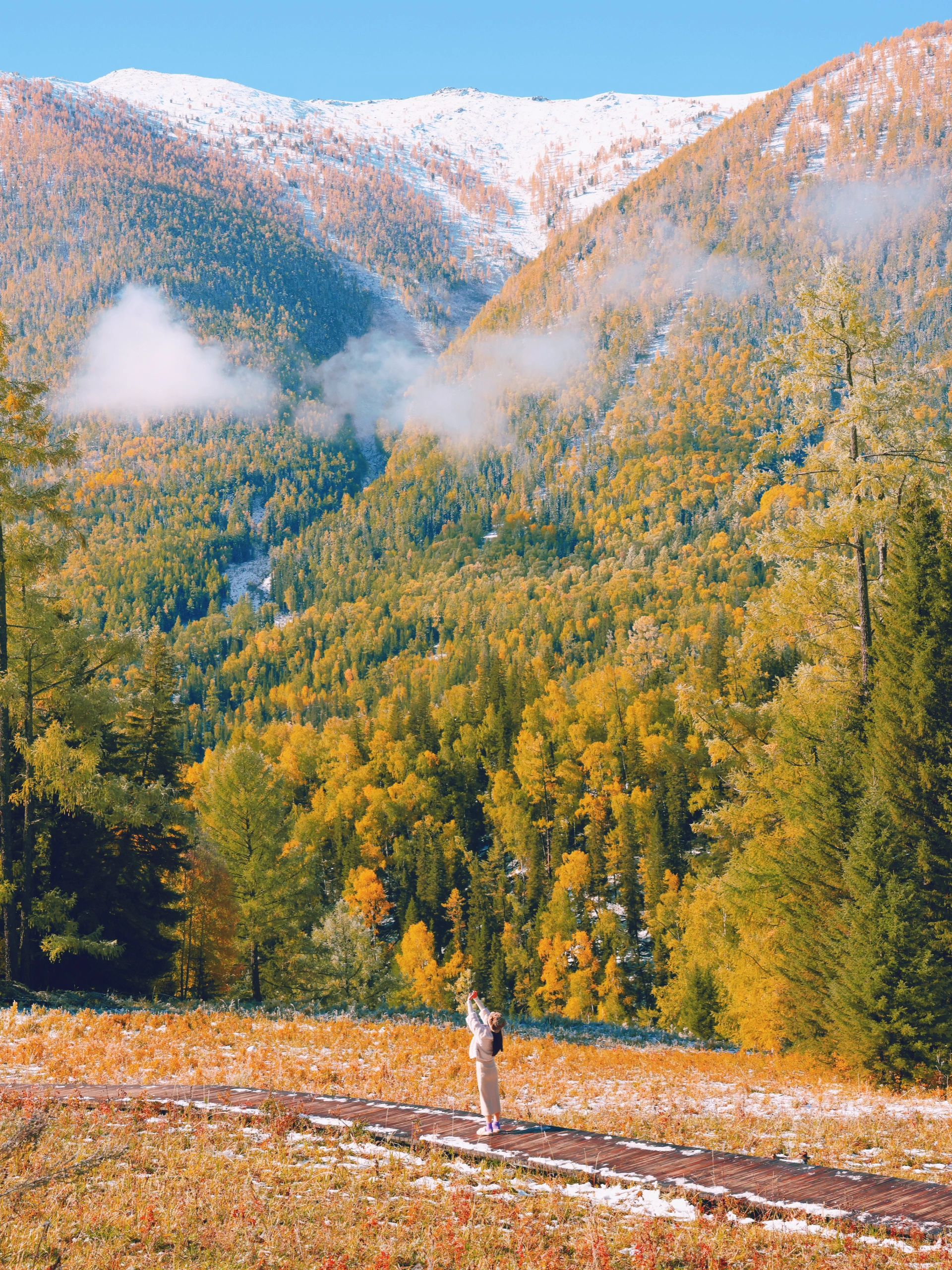 这几天的喀纳斯真的美哭了!可以同时看到雪景+秋色黄叶,清晨还有奶白色的晨雾,随处放养的牛羊群,随手拍都是油画里的景色,仿佛走进童话世界!