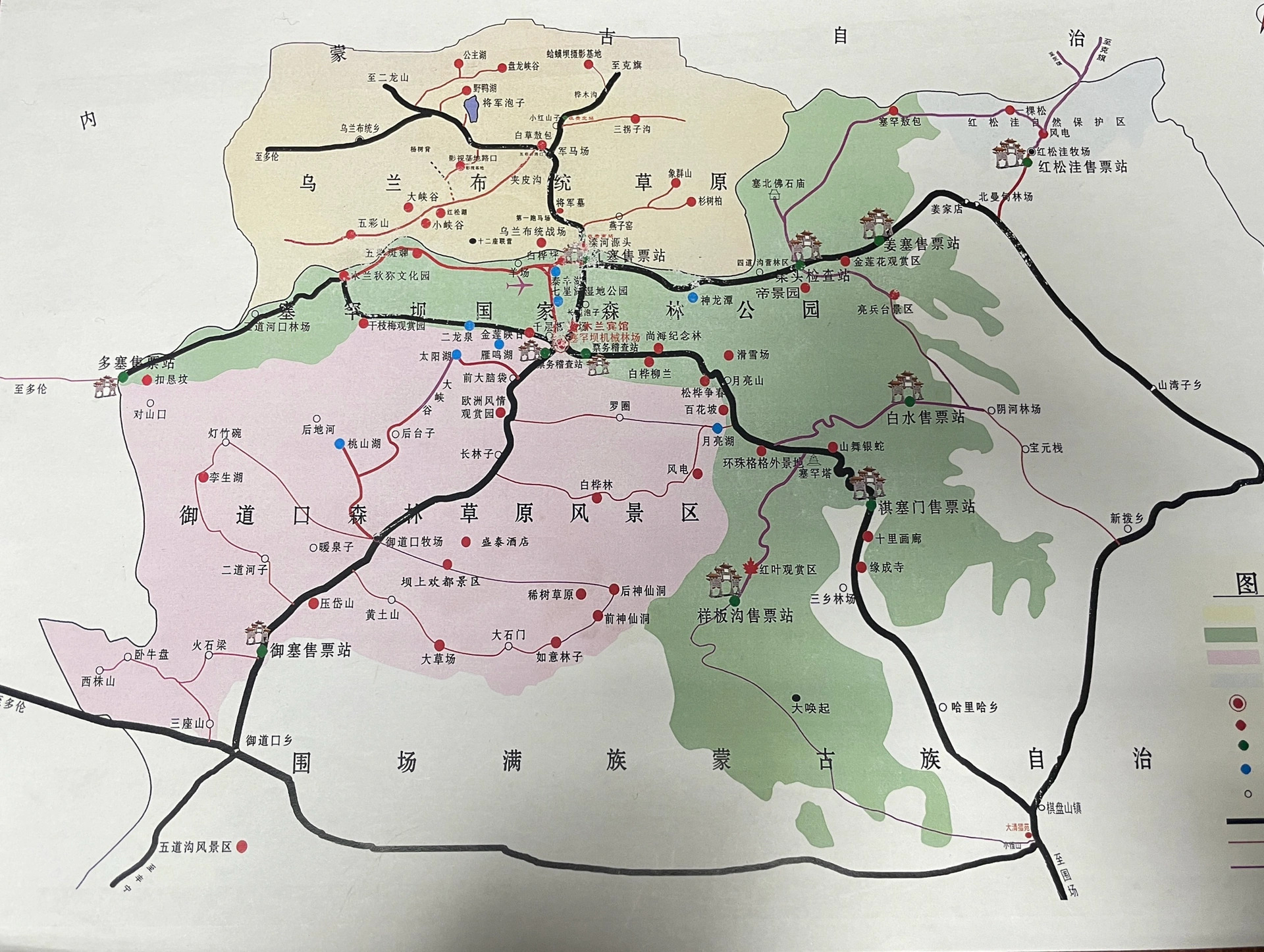 「御道口森林草原风景区」的门票景点包括太阳湖、大峡谷、龟山、桃山湖、月亮湖等,通票80元。除了月亮湖在棋赛线上,其他景点都集中在御道口。