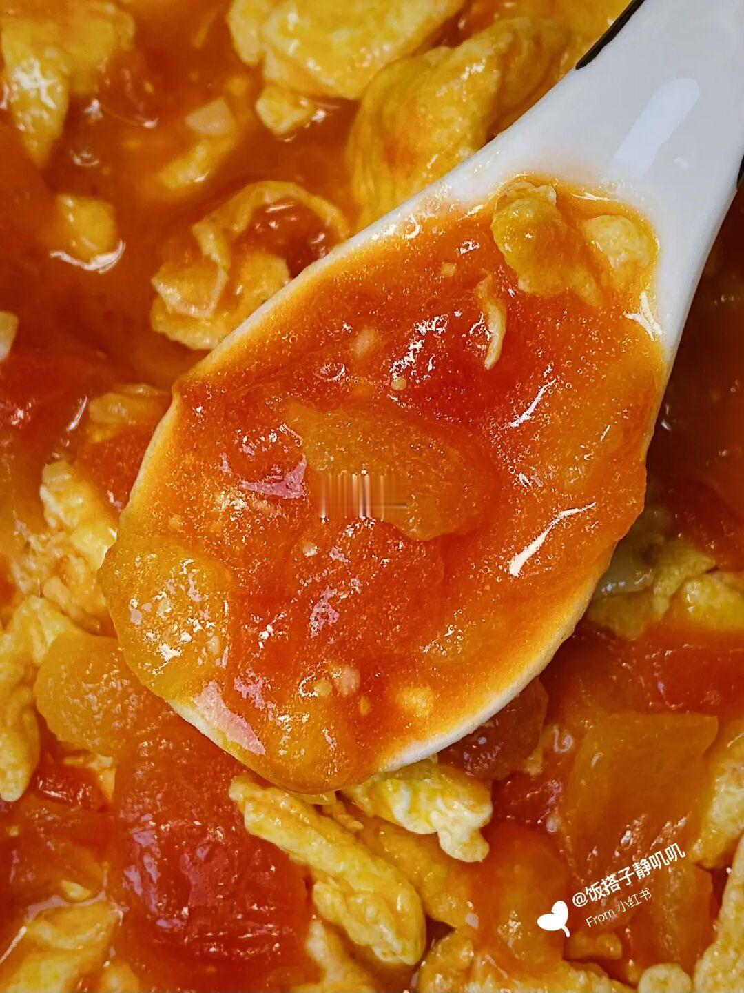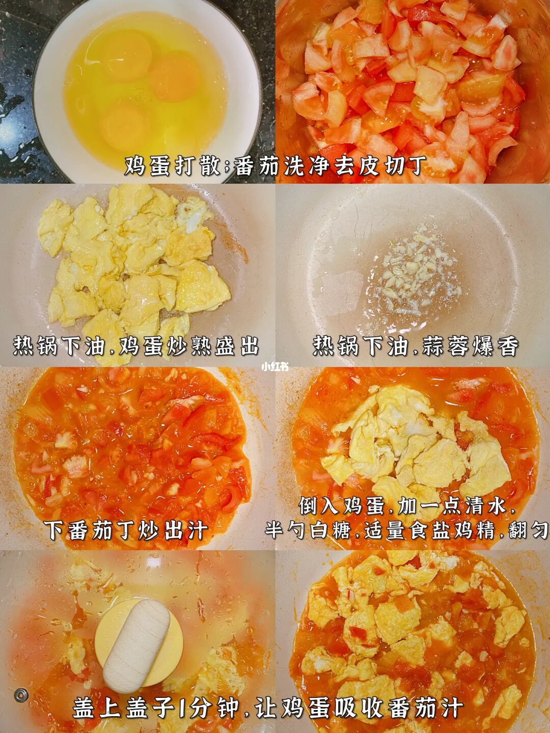 4⃣️加入鸡蛋,一点清水,半勺白糖,适量盐和鸡精,翻匀。盖上锅盖,咕咚咕咚1分钟,让鸡蛋吸饱番茄汁即可。