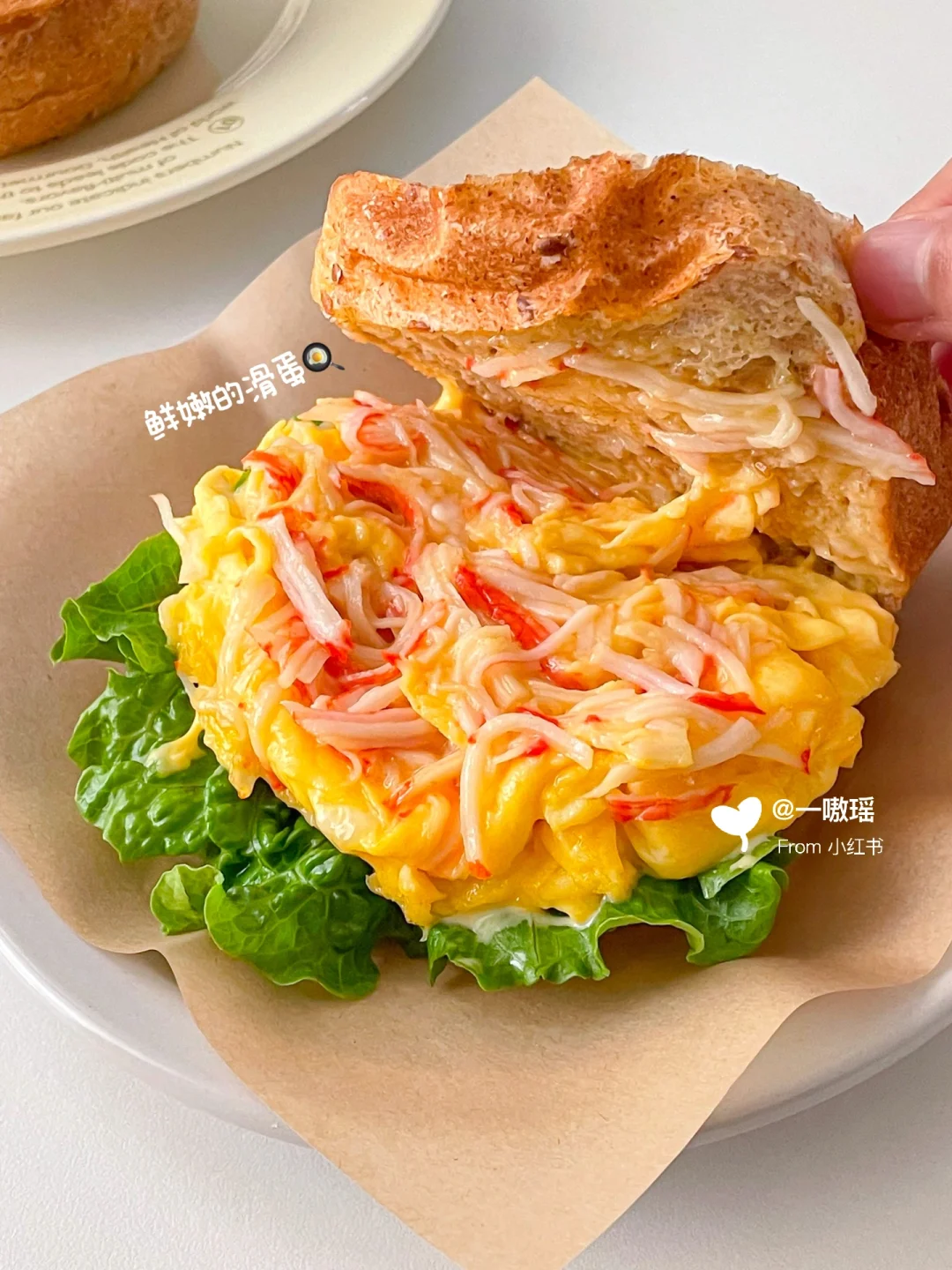 ▫️放入生菜、芝士片、蟹柳滑蛋