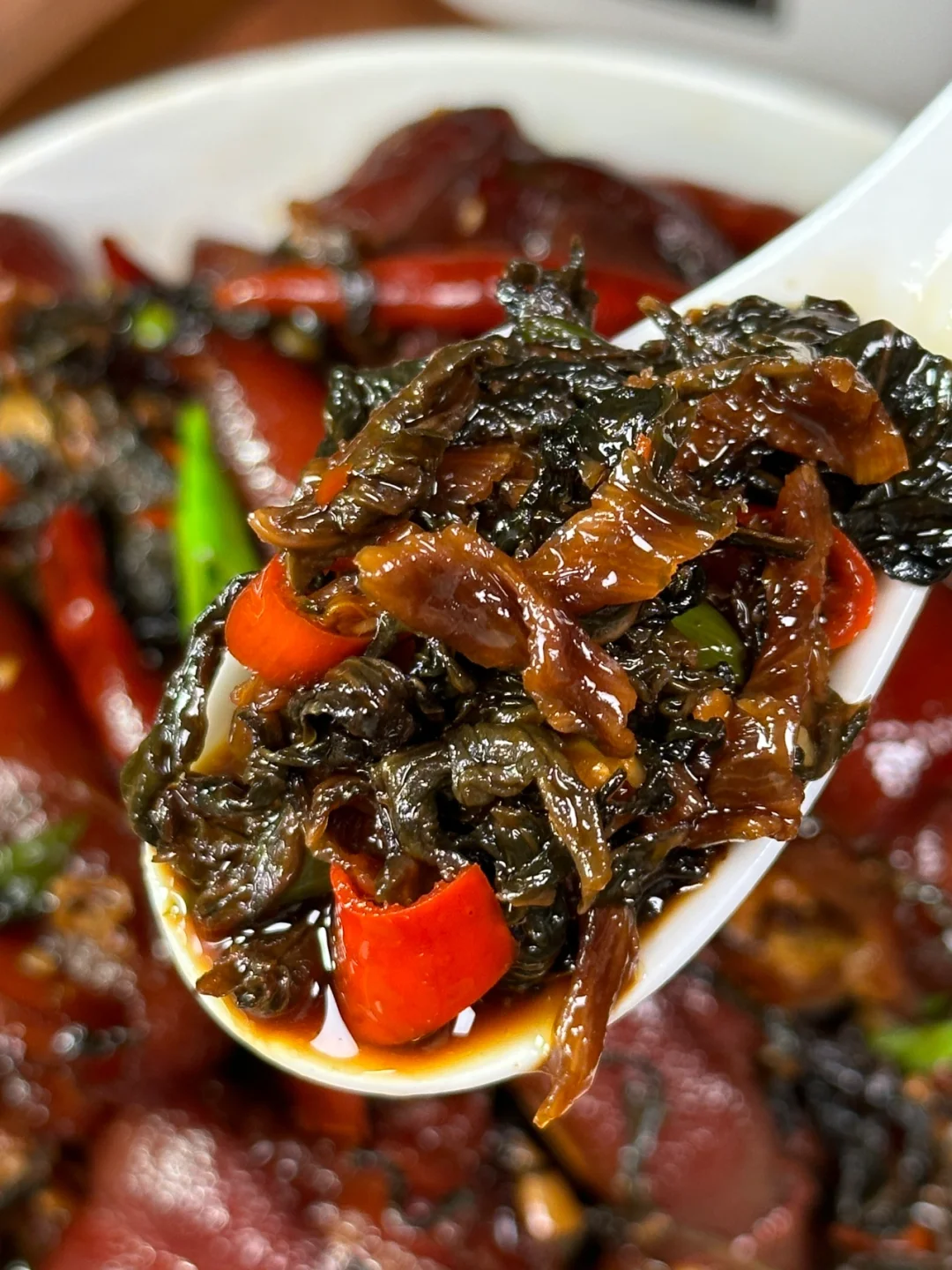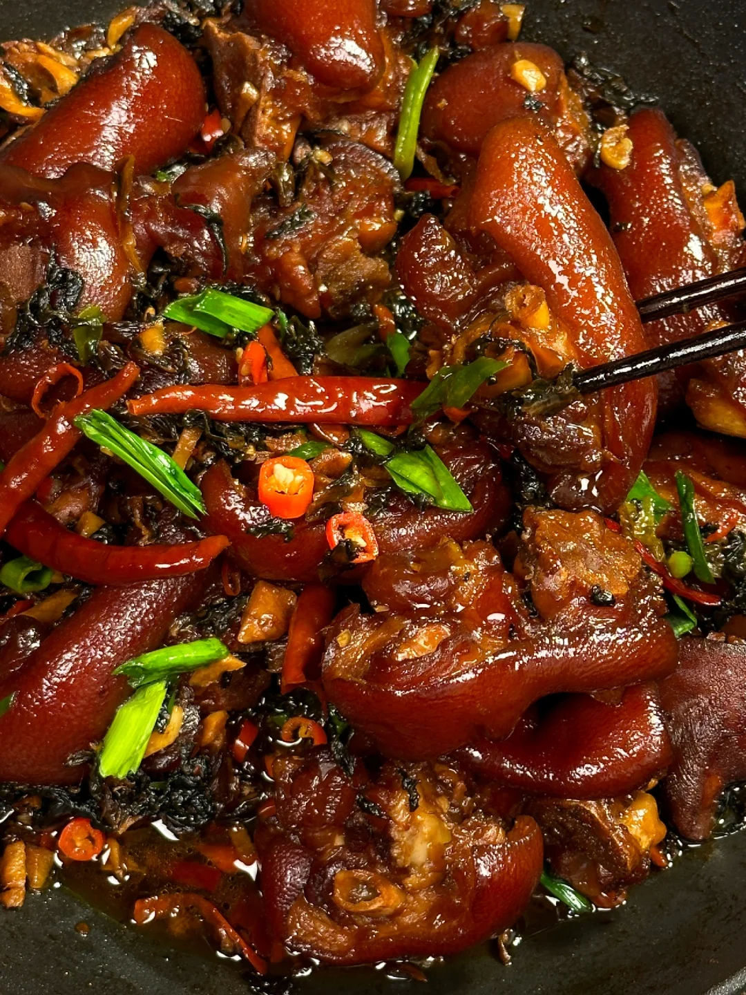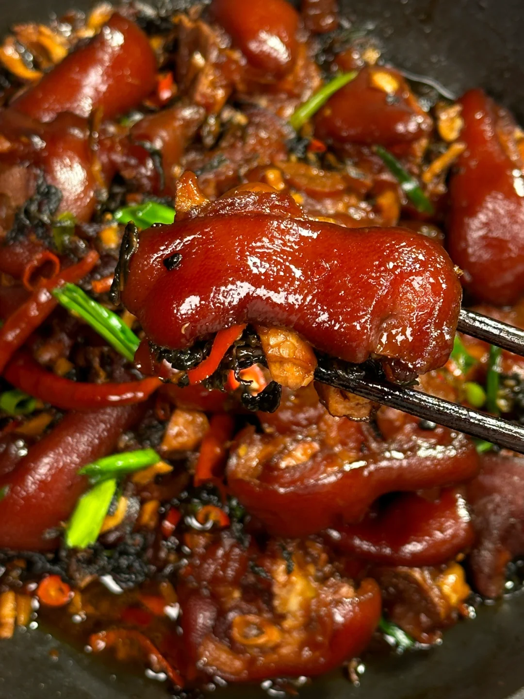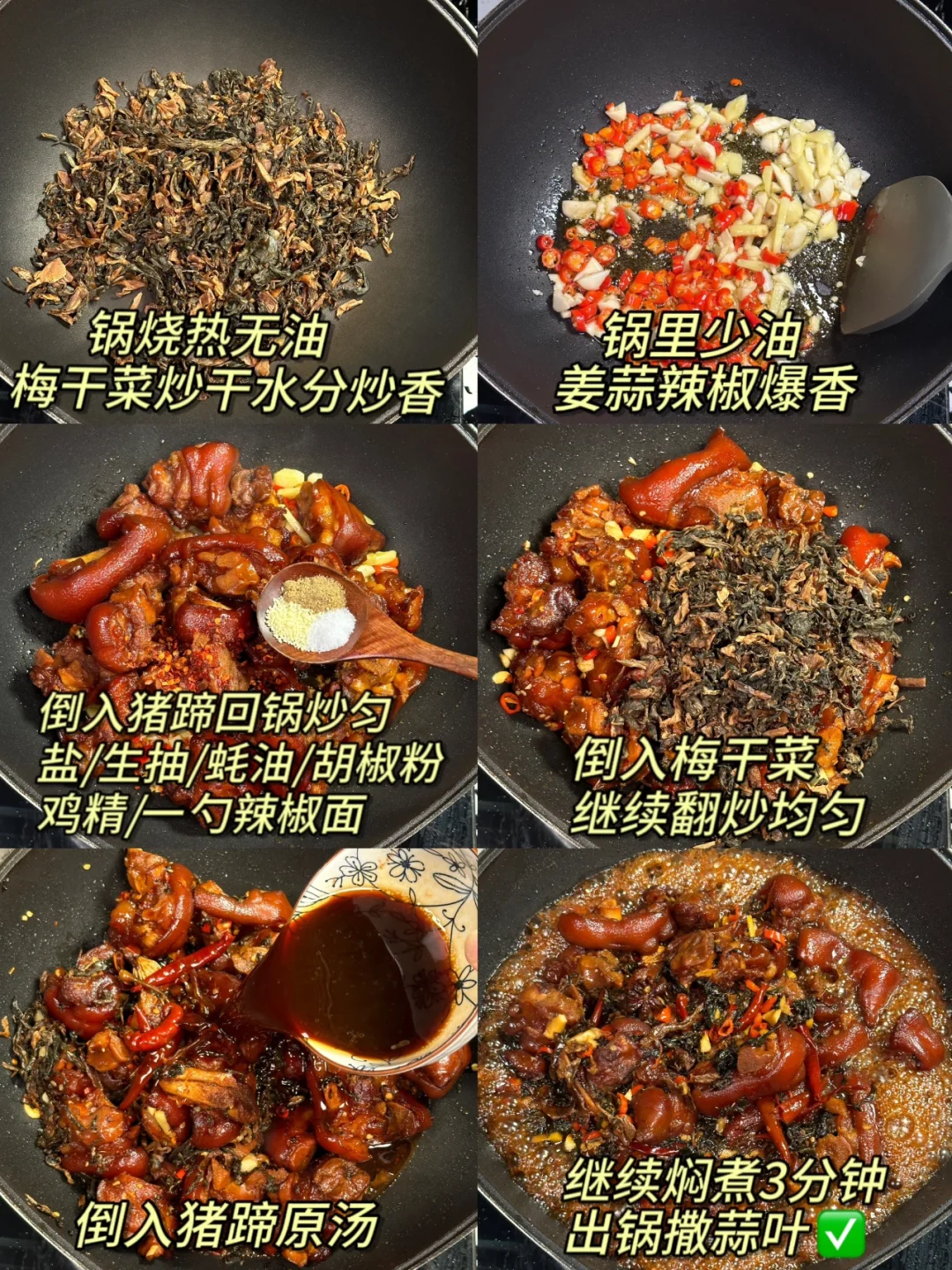 3️⃣锅烧热无油,倒入洗干净的梅干菜炒干水分炒香盛出,锅中少油,姜蒜辣椒爆香,倒入猪蹄,把猪蹄回一个锅,调味加点盐,生抽➕蚝油➕胡椒粉➕鸡精➕一勺辣椒面,倒入梅干菜翻炒均匀,接着倒入压猪蹄的原汤继续焖煮3分钟,出锅前加葱或蒜叶即可✅