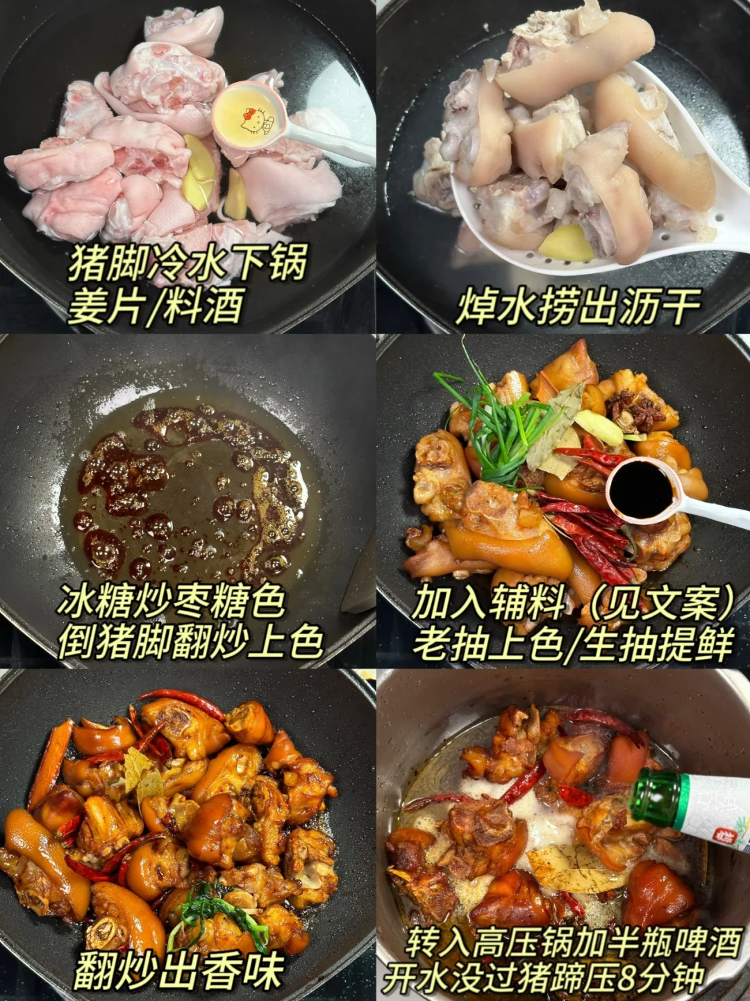 2️⃣锅烧热后倒油关中小火,放一把冰糖,慢慢顺一个方向搅动,炒成枣糖色微微冒泡的时候,立马倒入猪蹄迅速翻炒均匀上色(猪蹄颜色好看的关键🥰)接着放几片姜、葱节去腥,一把干辣椒增香,八角3个,桂皮1个,香叶2片,一点生抽提鲜,老抽上色,继续翻炒出香味,转入高压锅里面,加半瓶啤酒和开水没过猪蹄压8分钟(压猪蹄的原汤留着备用)
