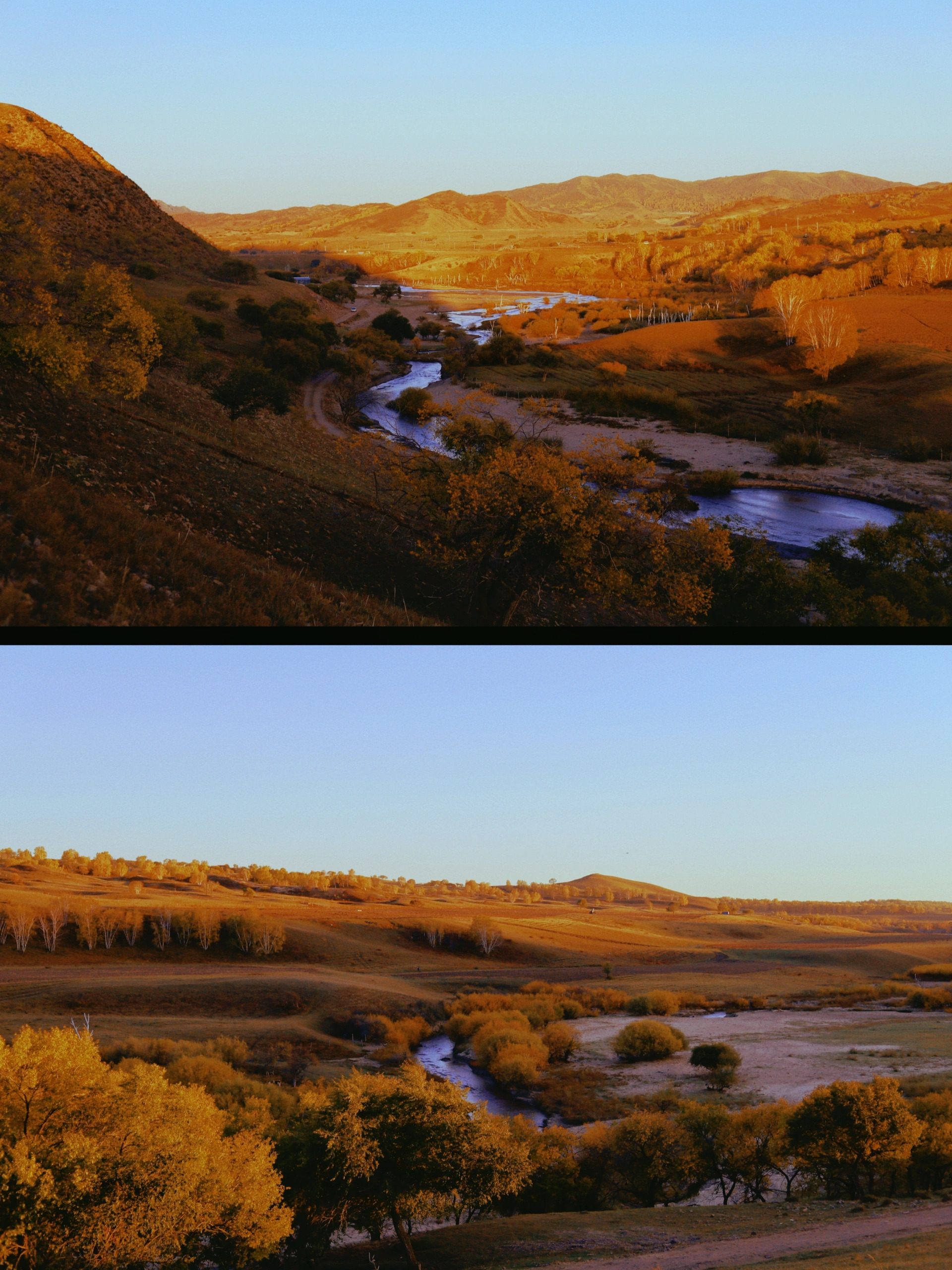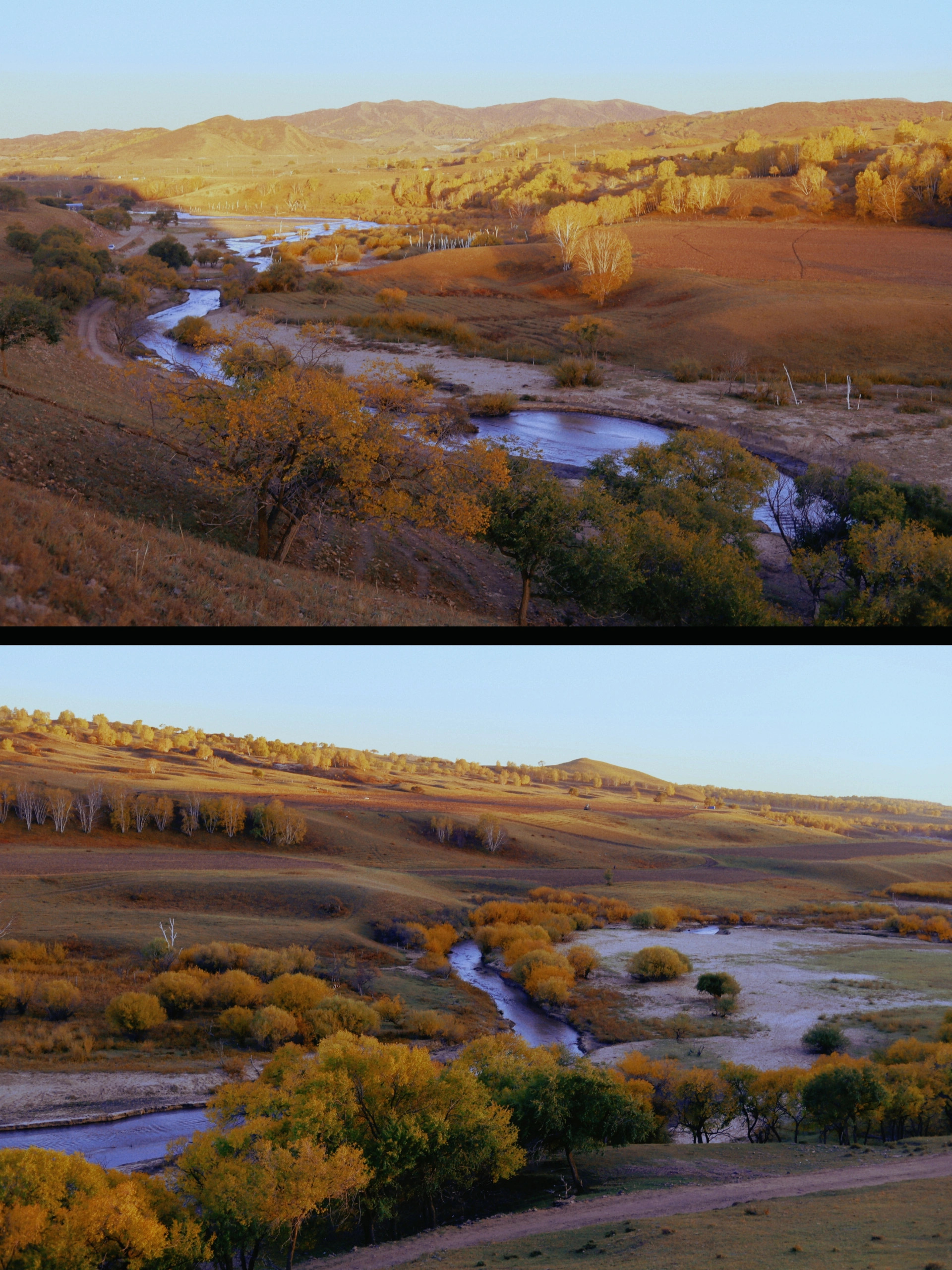 乌兰布统草原属于木兰围场的一部分,紧邻塞罕坝、御道口、红松洼等景区,以草原、森林和河流相结合的景观为主。乌兰布统尤以平原与丘陵交错的地形特色,形成所谓的“欧式草原风光”,实地看来,确实层次丰富,有一种明暗相间的生动感。今年秋季来得晚一些,国庆假期刚好赶上乌兰布统最美的时候,心动的小伙伴趁着秋意未尽赶紧出发吧~