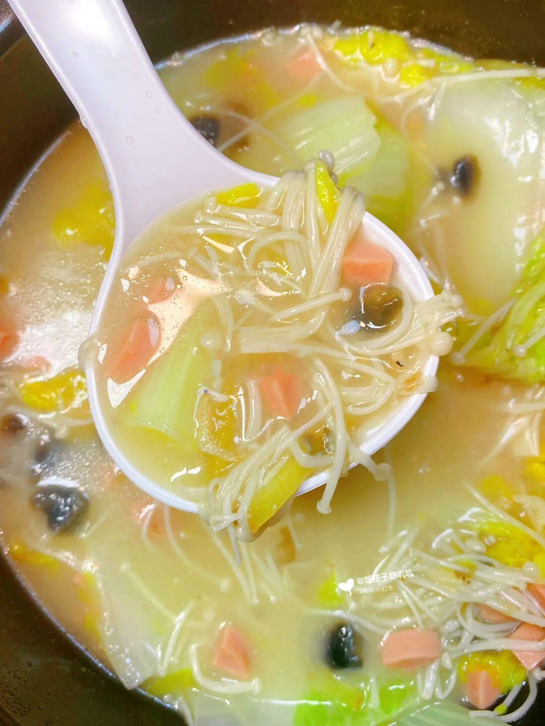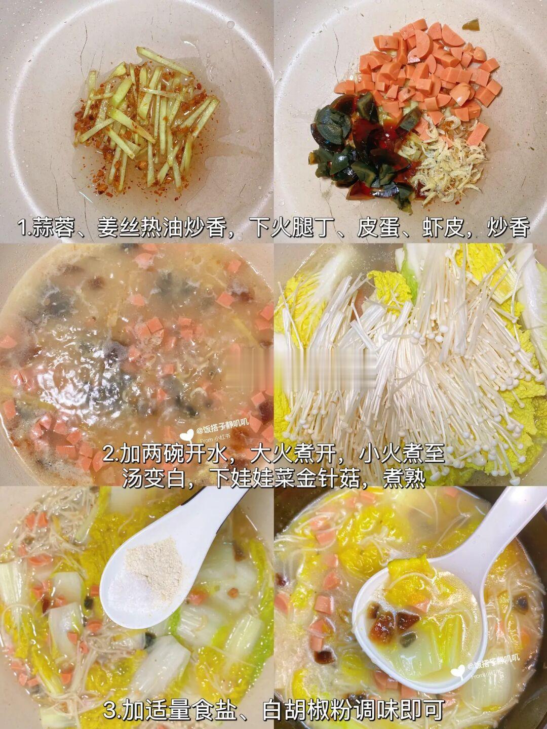 3⃣️ 下娃娃菜、金针菇,煮熟,加适量食盐、白胡椒粉调味即可。
