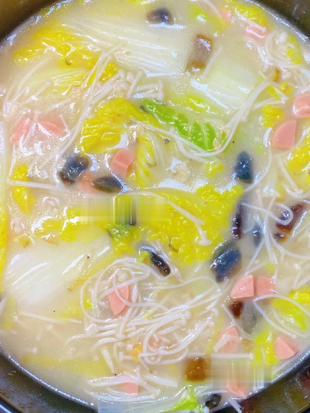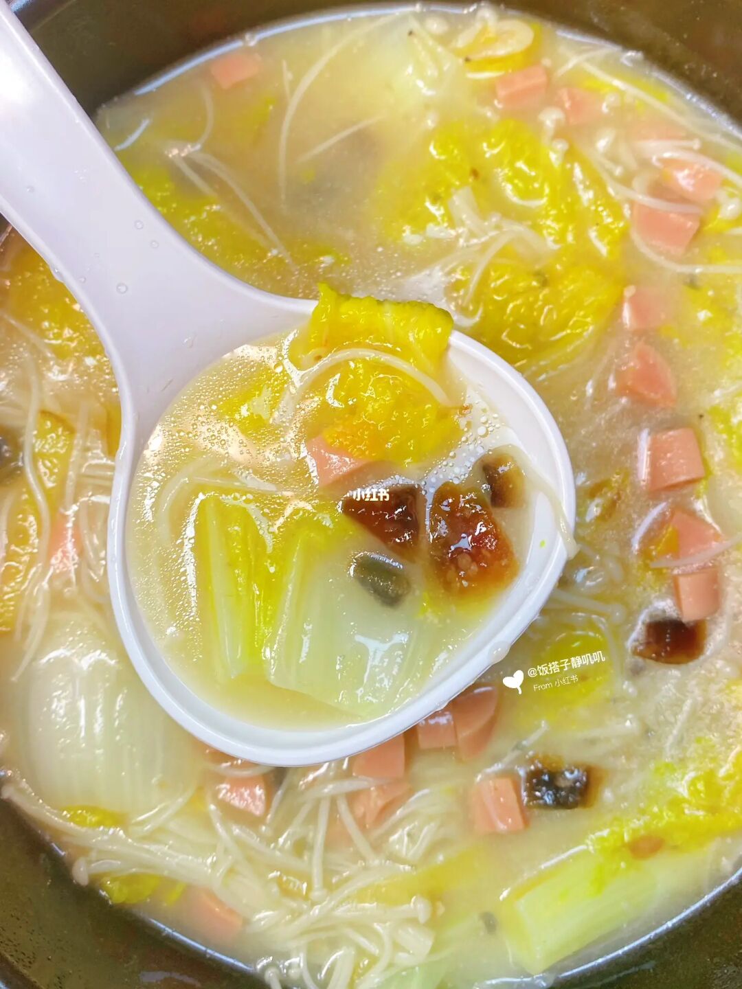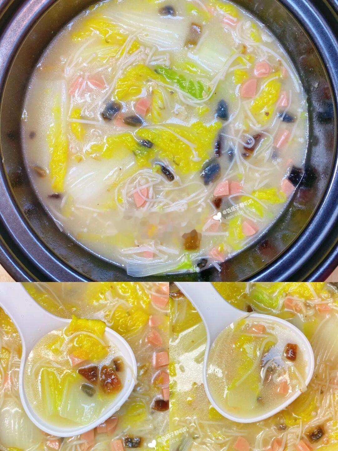 🥣 食材:娃娃菜、金针菇、火腿肠(1根)、皮蛋(1个)、虾皮(一勺)