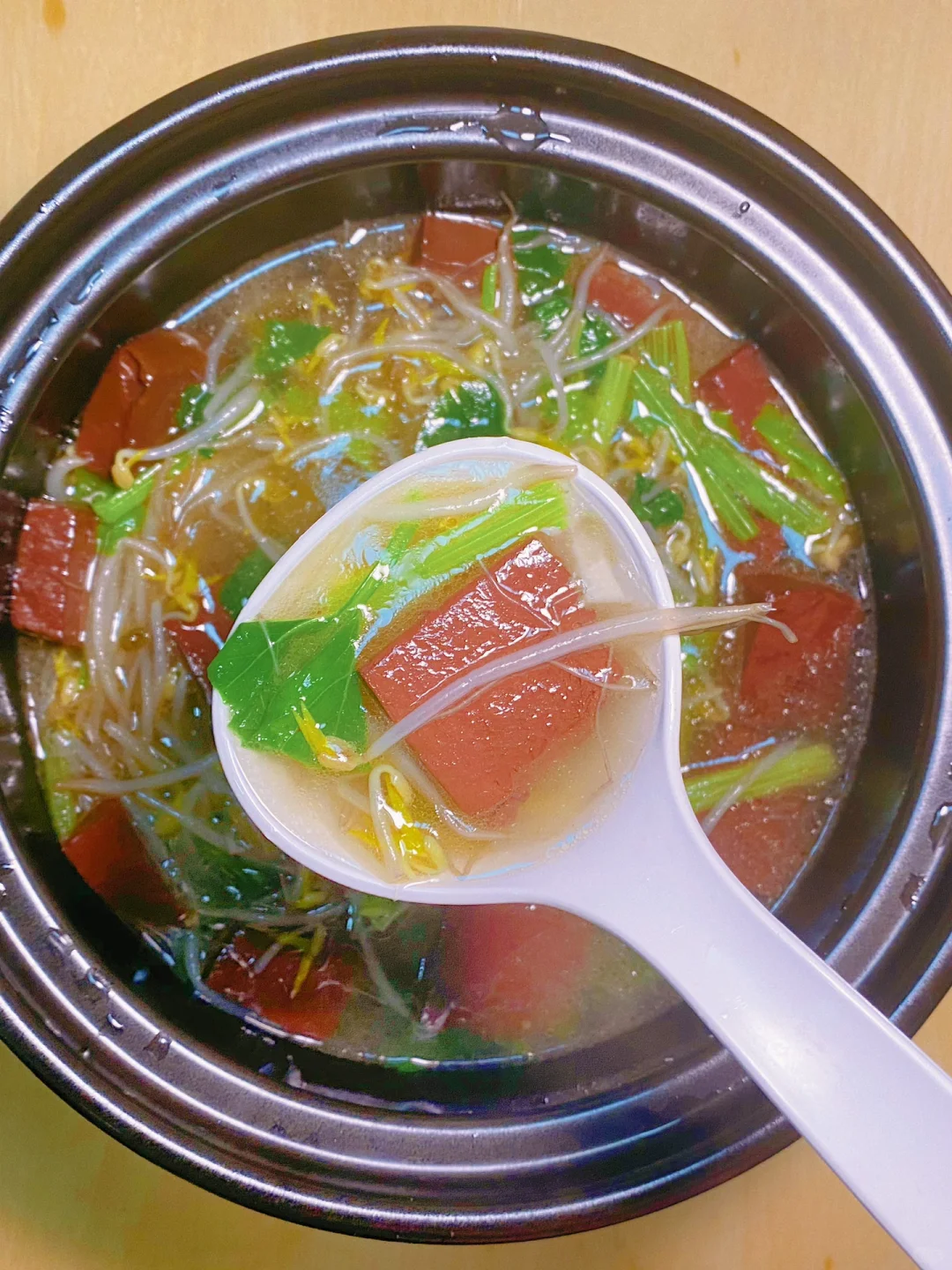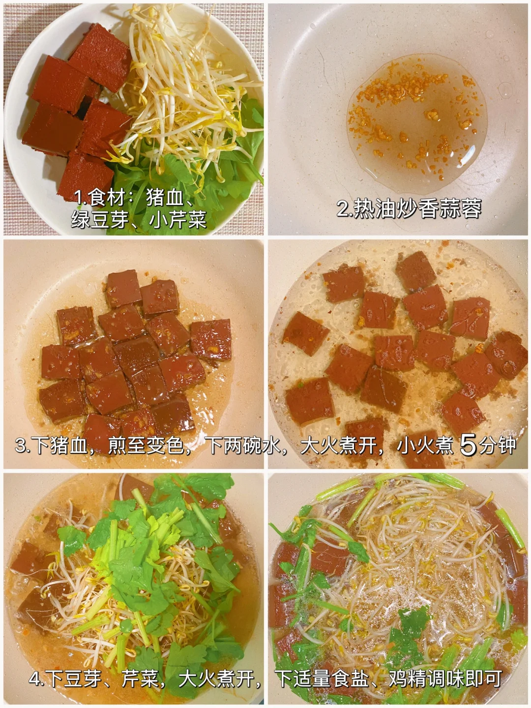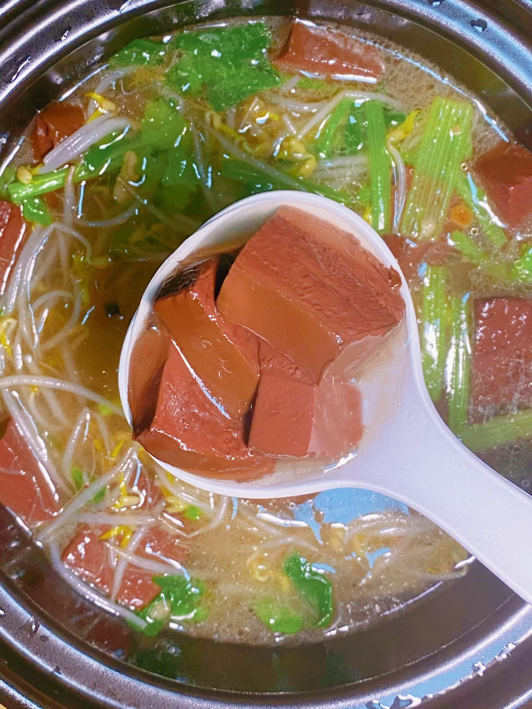 →食材:猪血、绿豆芽、小芹菜、蒜头