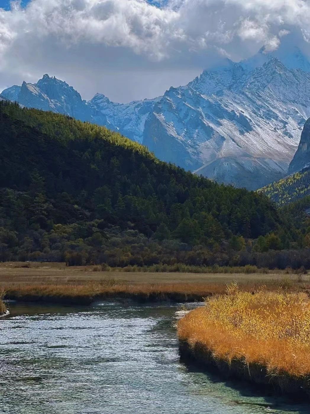 👍秋季前往亚丁,冲古草甸已是一片金黄,央迈勇雪山留下的积雪融化汇集成溪流,牛羊悠闲的漫步于草甸,漫山的彩林,涌动的白云,惬意的马儿,一派田园山居风光