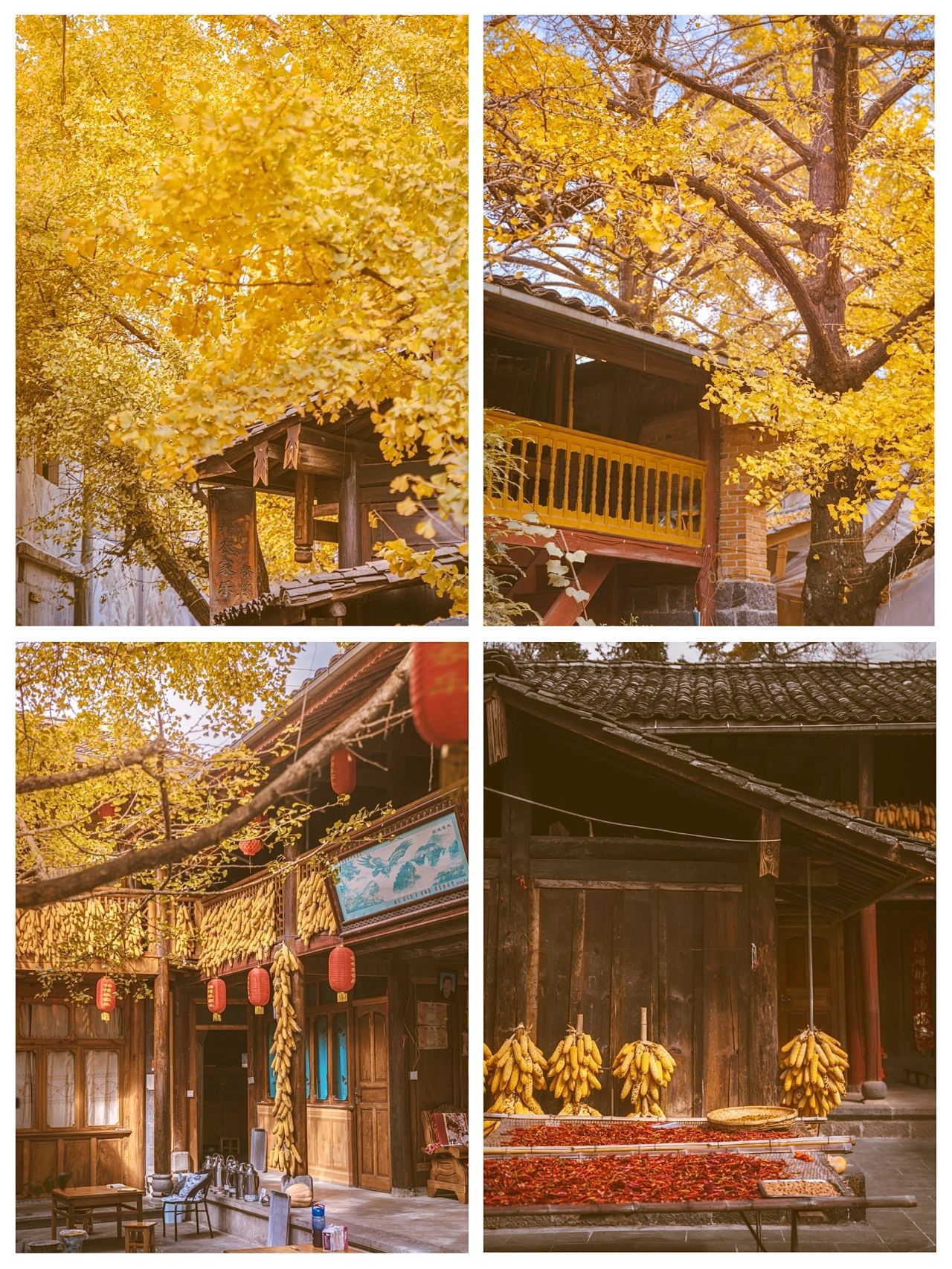 村里每家每户院内都有载着几棵银杏树,门头挂着灯笼,梁上晒着玉米,银杏叶铺满地,脚踩上去还会发出吱吱呀呀的声响