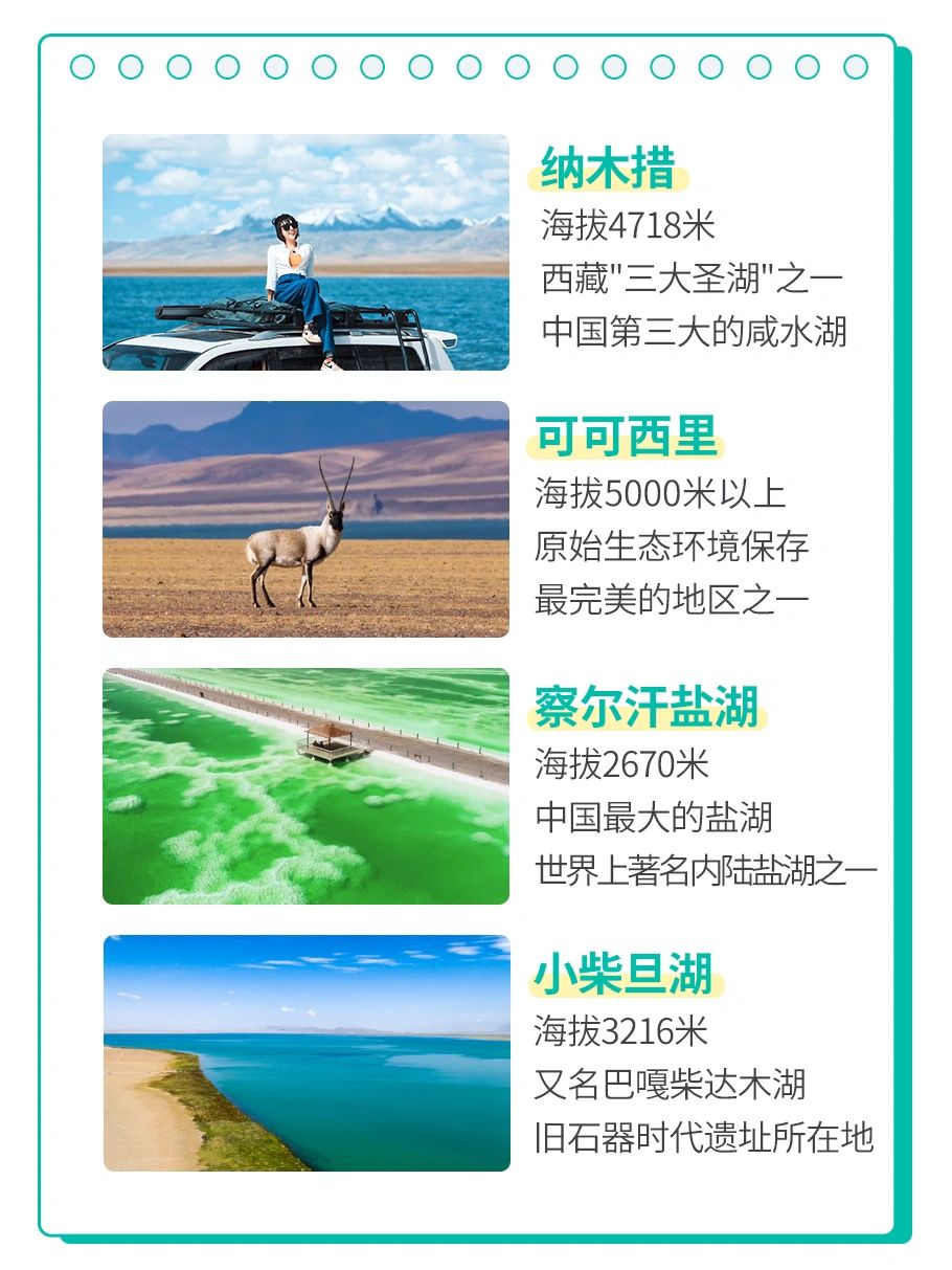 纳木措、唐古拉山、可可西里、察尔汗盐湖、翡翠湖、戈壁公路、茶卡盐湖、青海湖 🔸G318 川藏线
