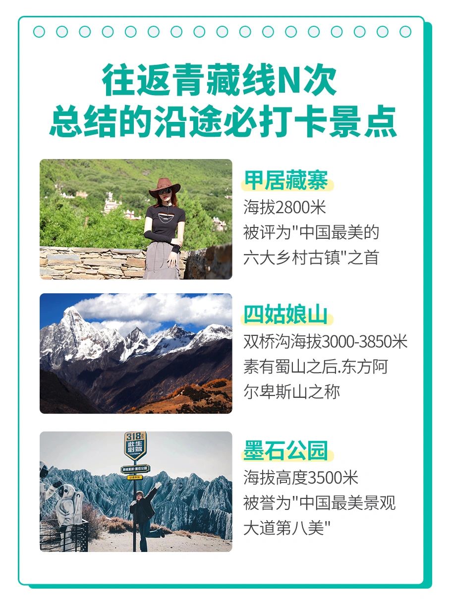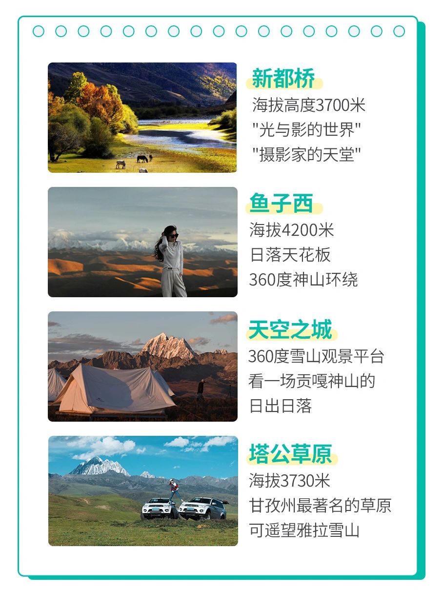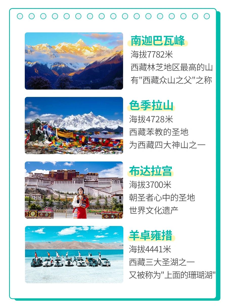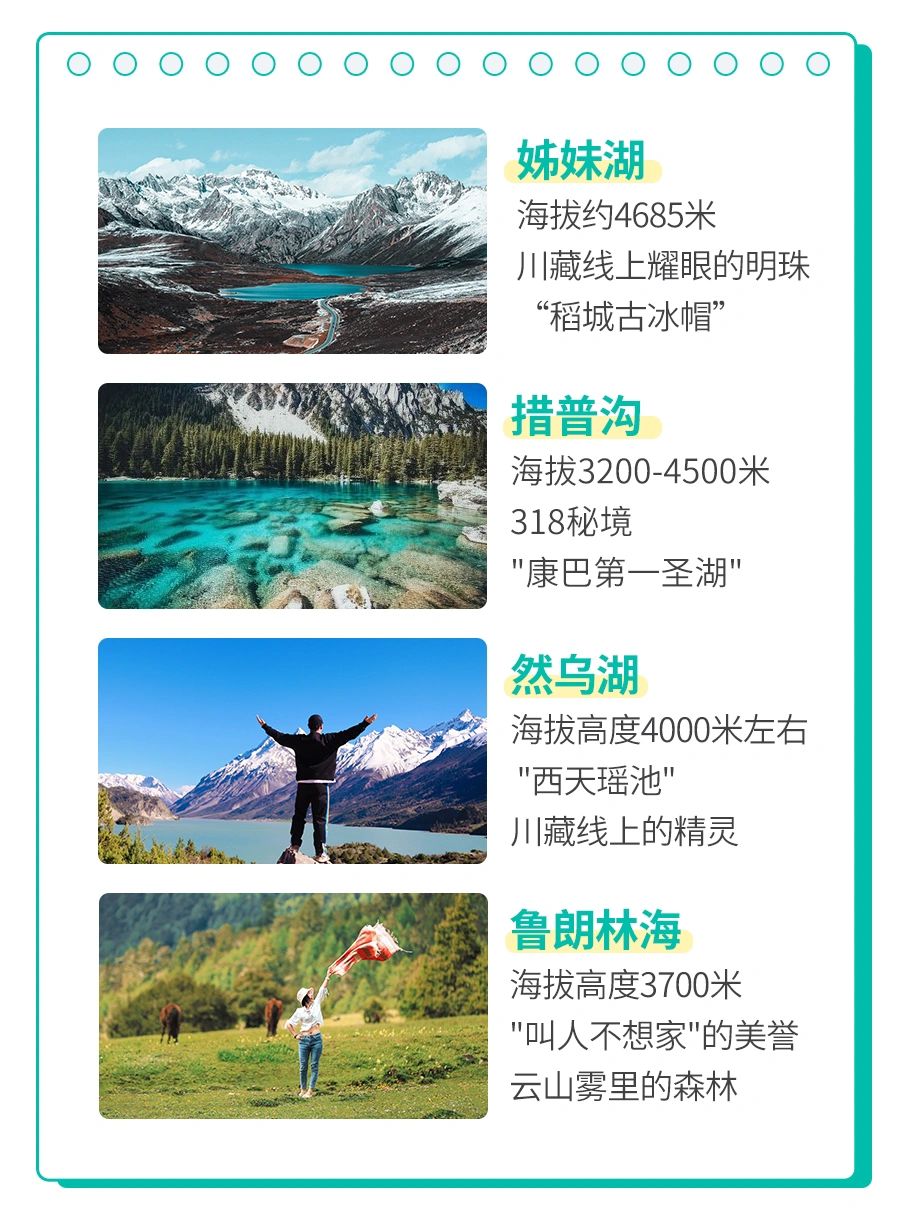 四姑娘山、巴郎山、墨石公园、塔公草原、鱼子西、毛垭草原、姊妹湖、怒江72拐、然乌湖、南迦巴瓦、林芝、羊湖、布达拉宫、大昭寺八廊街