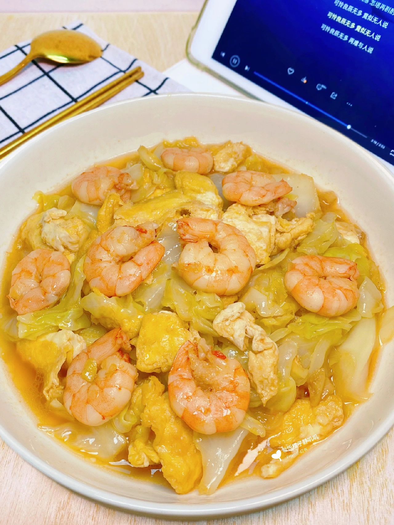 →食材:虾仁、鸡蛋、包菜
