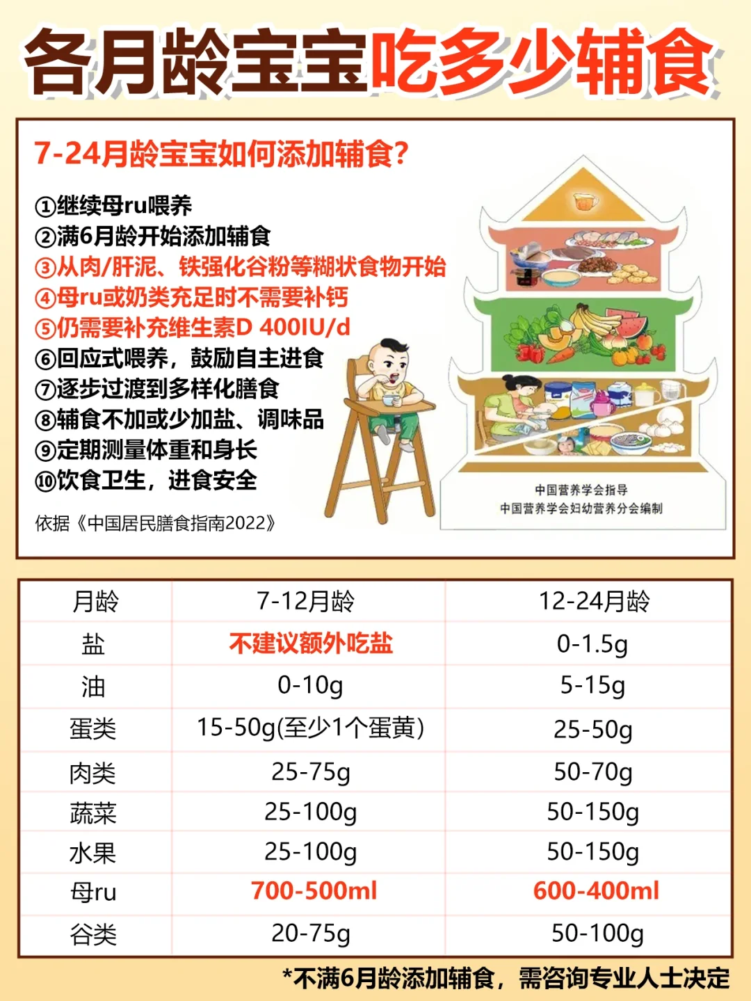 [六R]1岁内辅食不追求份量,重点在于培养进食乐趣和习惯,如果实在担心自家辅食添加得过多或过少,可以参考《中国居民膳食指南2022》里7-24月龄宝宝的辅食量,见图④