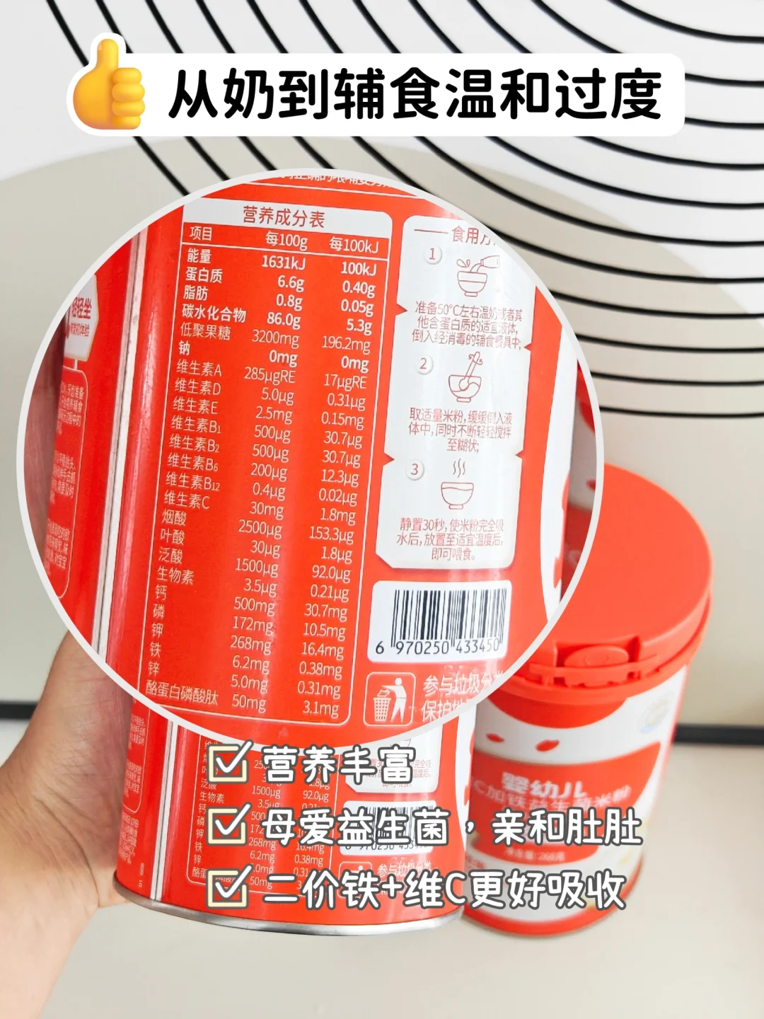 选大品牌、配料表干净的,因为6个月的宝宝体内储存铁基本上消耗完了,所以有效补铁是关键,那么要看准配料表有无这铁三角:🔍二价铁、维C、益生菌,