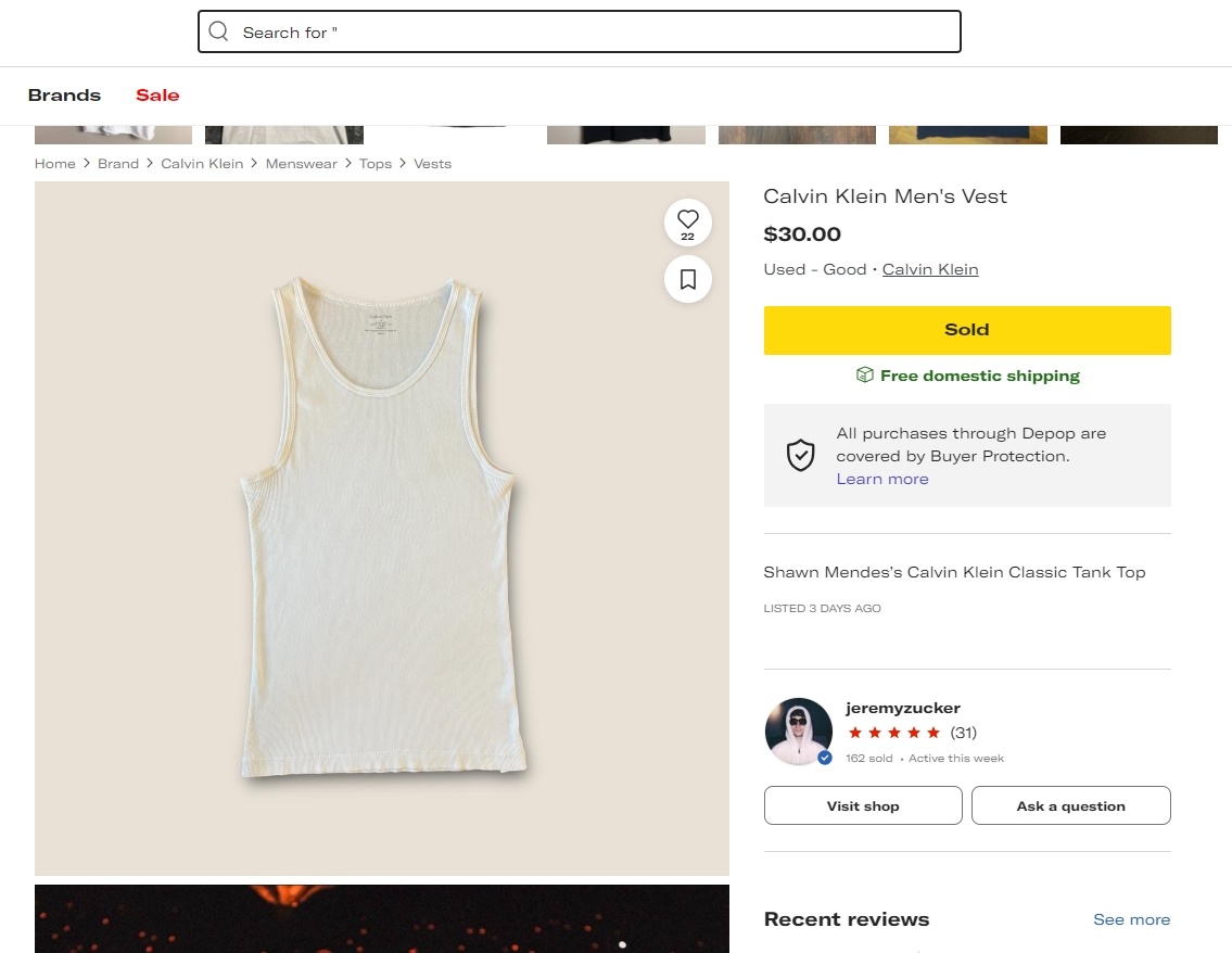 加拿大过气偶像男歌手 Shawn Mendes 为响应二次利用+环保理念,参与美国歌手Jeremy Zucker的二手衫义卖活动,将自己在巡演中所穿的原味Calvin Klein白背心捐出。最后该背心以30美元的价格成交。本次义卖收益全部捐给One Tree Planted环保组织。