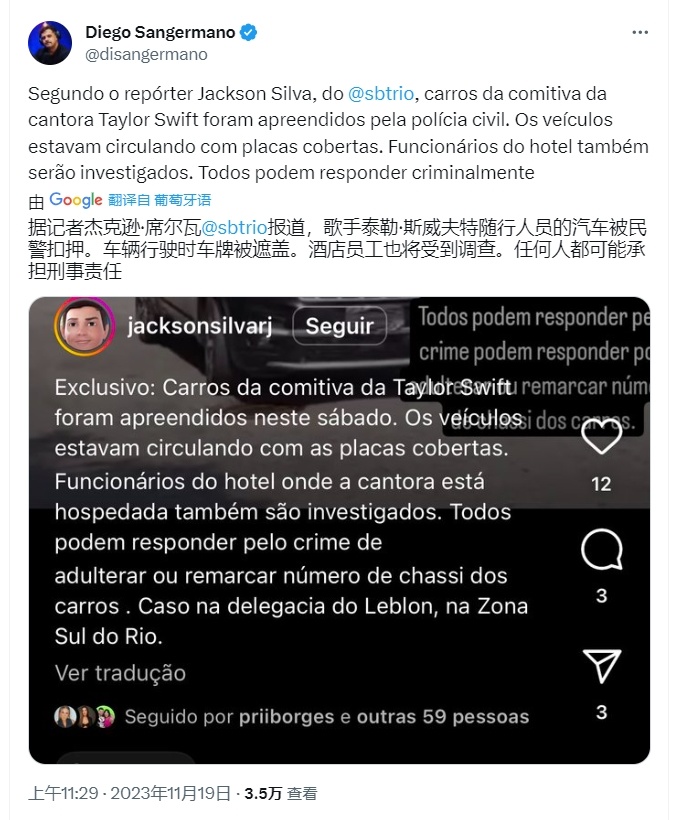 随后霉霉的随行人员的汽车已经被当地警方扣押,入住酒店员工也将受到调查。所有涉案人员都可能被追究刑事责任。据悉巴西法律规定,篡改、标记或隐藏车辆的车牌将被判处三至六年监禁,并罚款。