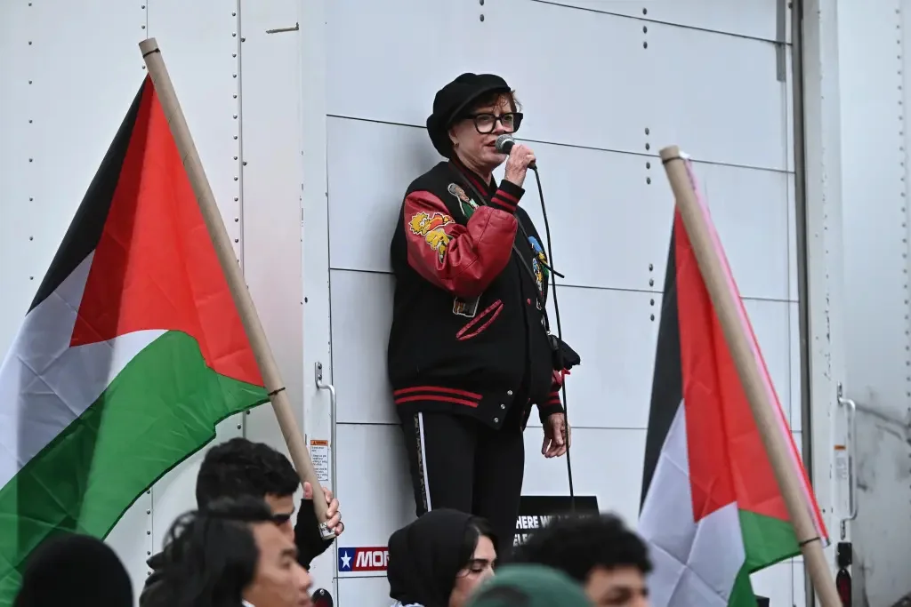 苏珊·萨兰登直言不讳地在支持巴勒斯坦的集会上谈论巴勒斯坦正在发生的种族灭绝。