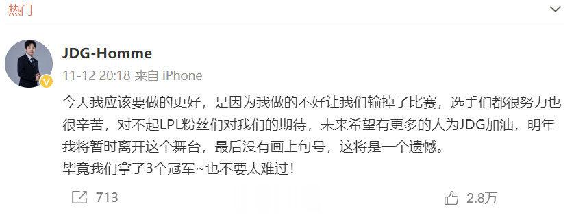 #jdg官宣homme离队# 【JDG京东电子竞技俱乐部人员变动公告】