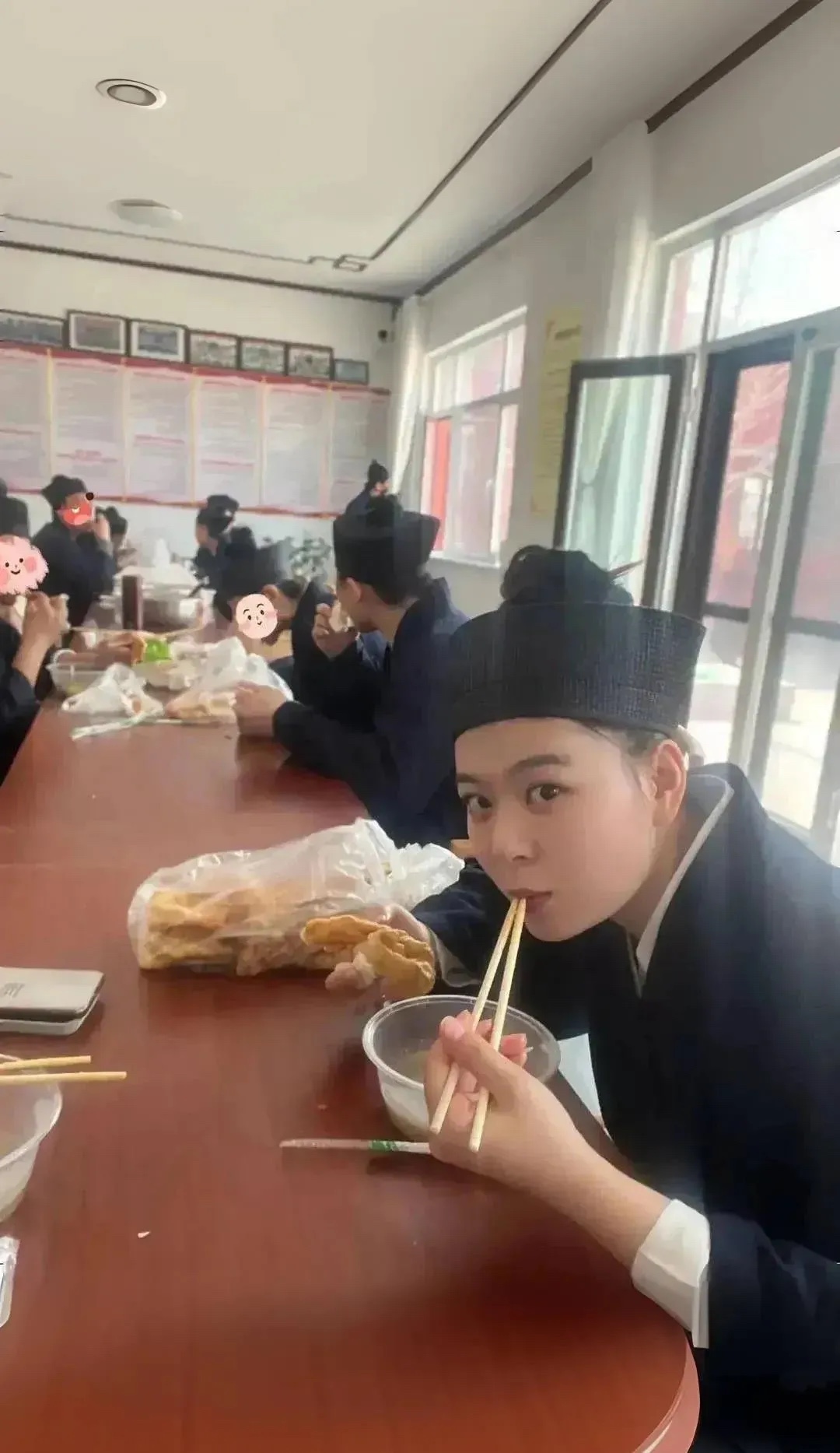 照片中,她头戴圆形道冠,身穿黑色道袍。她皮肤白皙细腻,面容如桃花,脸上的肌肤感觉一碰就会冒出水珠。此时,她正在张简易的餐桌上吃早餐。