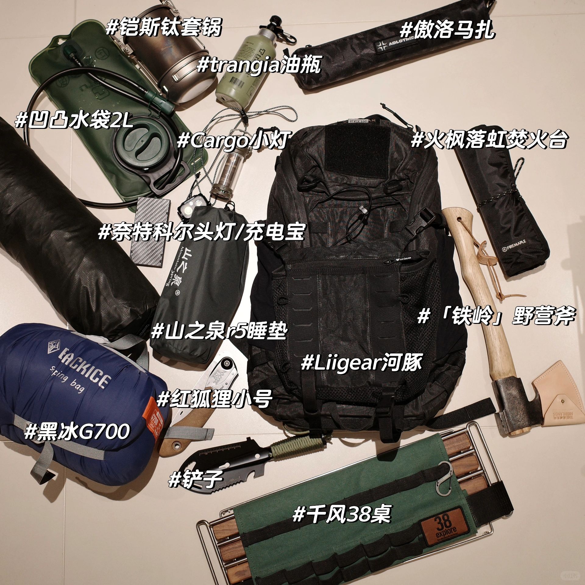工具:铁岭野营斧/红狐狸锯/铲子/奈特科尔头灯/轻量化充电宝/cargo小灯/落虹焚火台