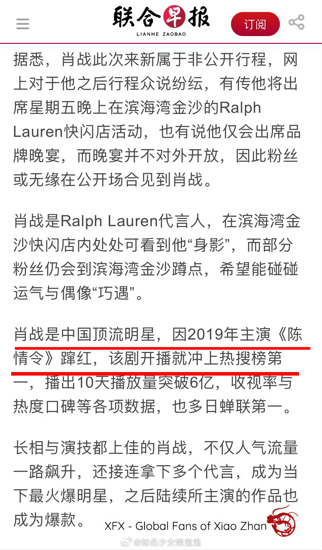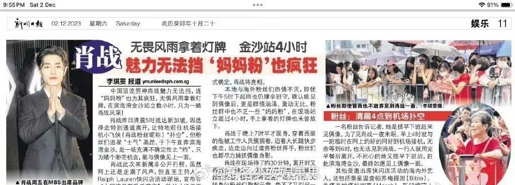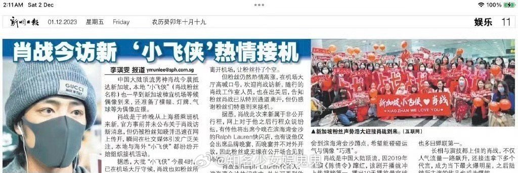新加坡联合早报报道肖战!称肖战为中国顶流明星,据悉!该媒体为新加坡最有影响力的媒体!同时肖战的新加坡之行还登上了世界趋13。这还是在肖战活动未公开未宣传,粉丝自发行为的结果。内娱断层顶流名不虚传!#肖战登新加坡报纸#