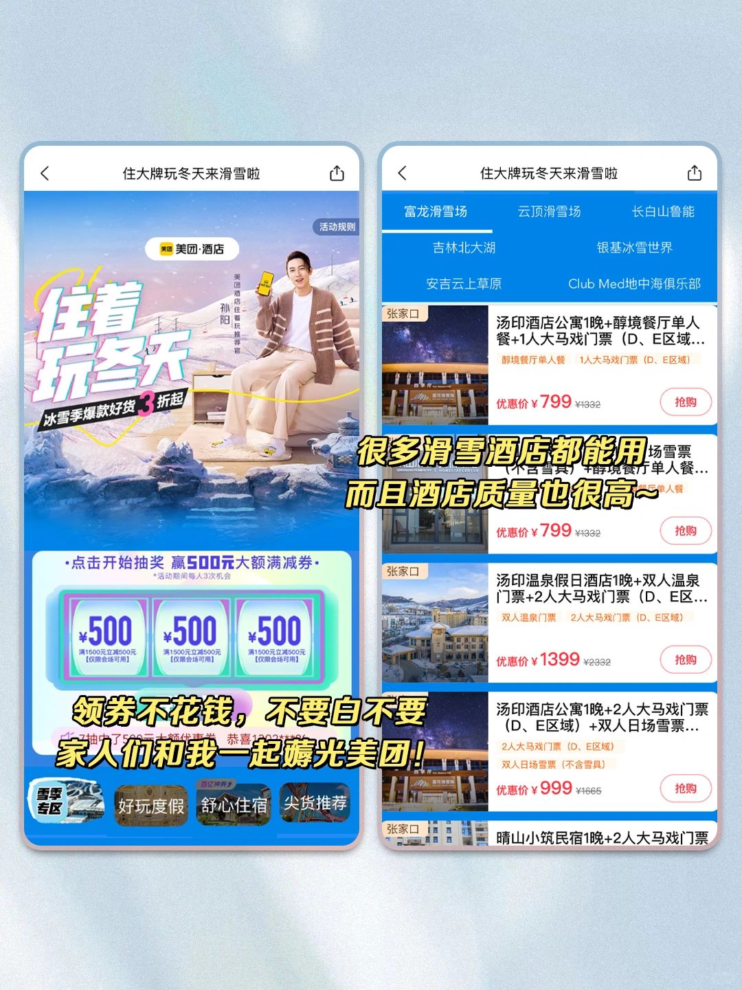 打开【美团】,输入【1️⃣1️⃣2️⃣0️⃣3️⃣】,进入活动界面,领百亿神券,超多家滑雪酒店都能用!而且酒店的质量也很高~