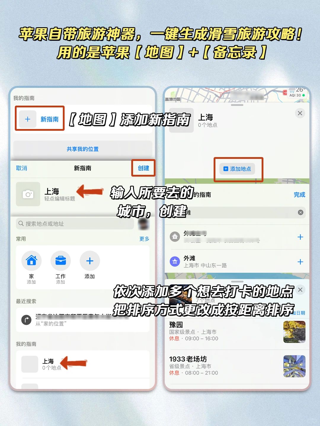 【地图】添加新指南→输入所要去的城市,创建,依次添加多个想去打卡的地点,把排序方式更改成按距离排序