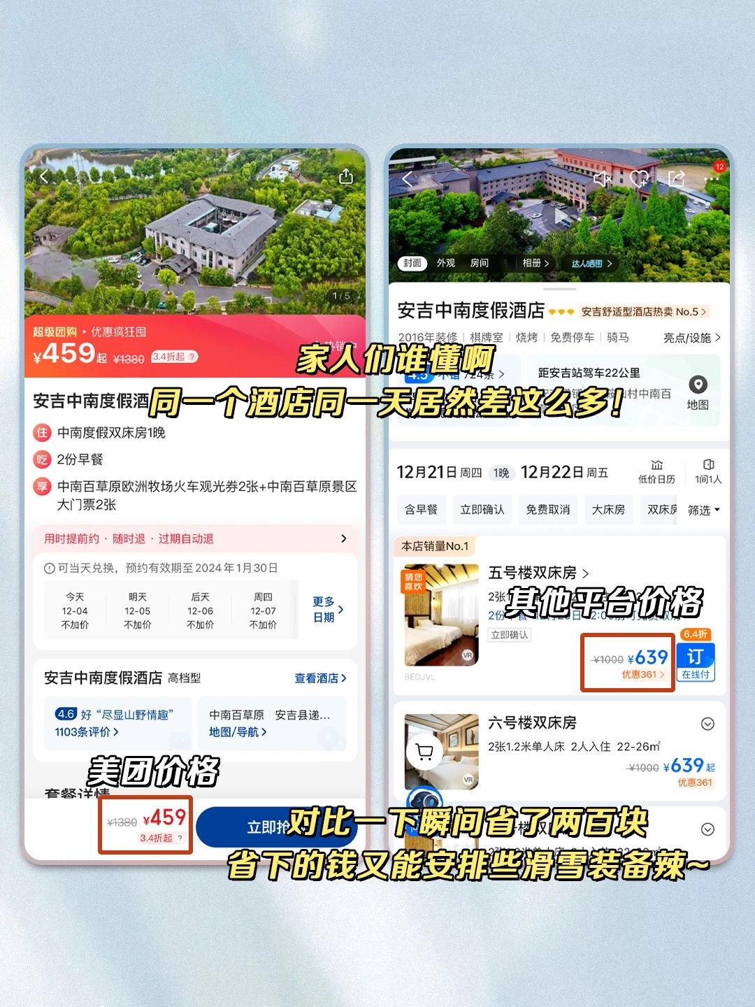 瞬间省了好几百,省下的钱又能安排些滑雪装备辣~