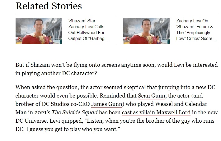 丽薇Zachary Levi在接受采访时,被问到他是否有兴趣在DCU里扮演新角色,回答这个问题的时候丽薇阴阳了一把Sean Gunn说:“听着,当你是DC掌门人的亲弟弟时,我想你可以拿到你想拿到的任何角色。”