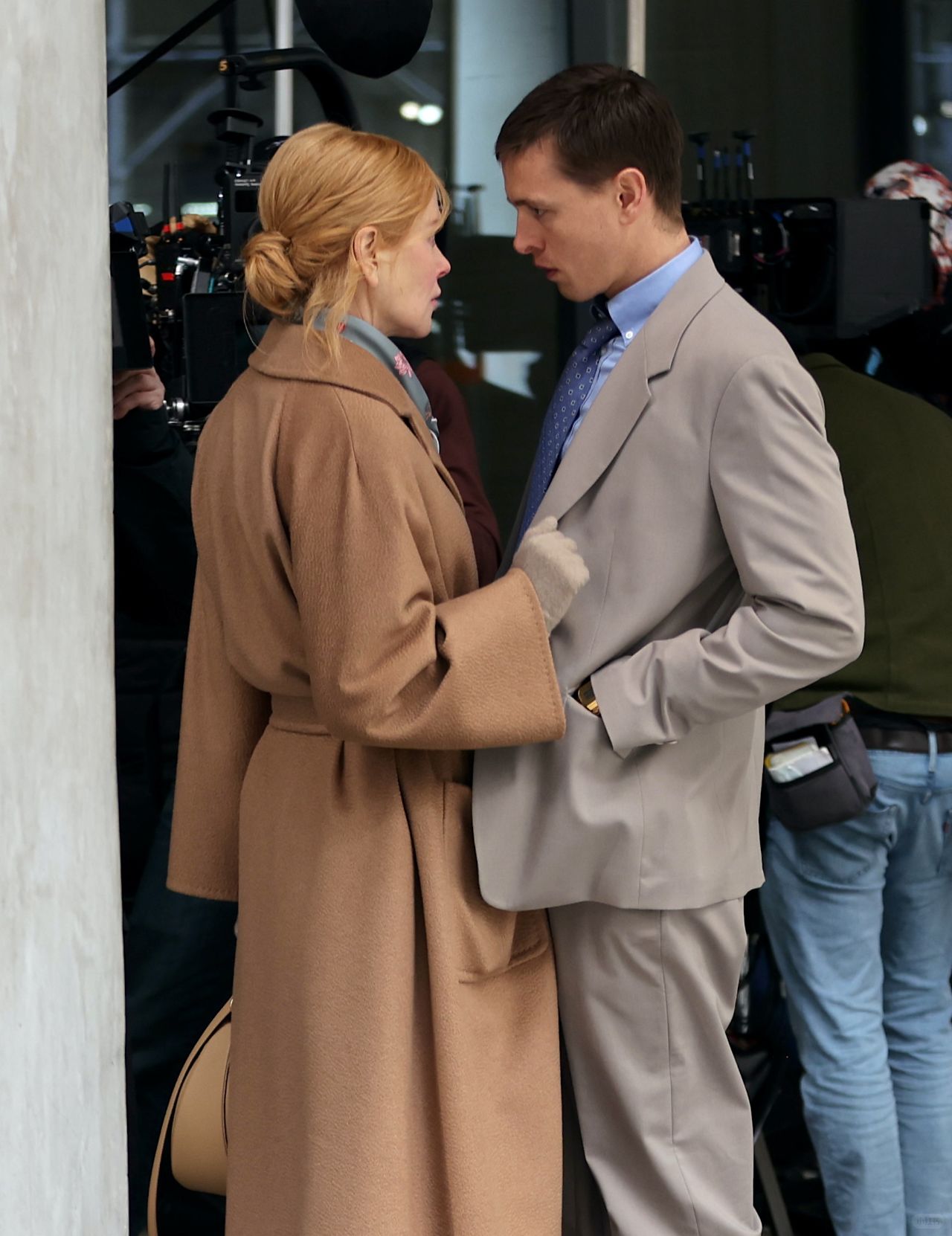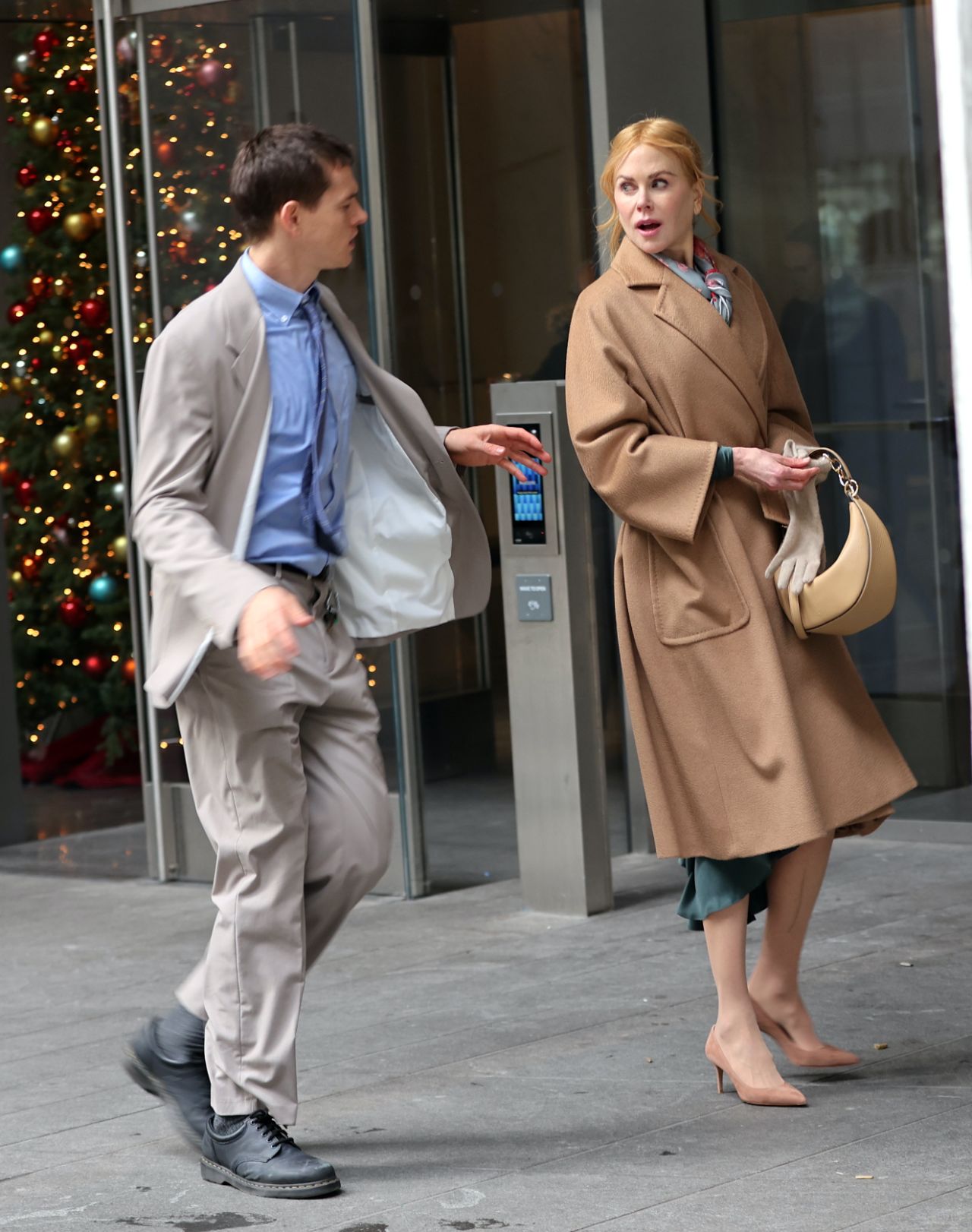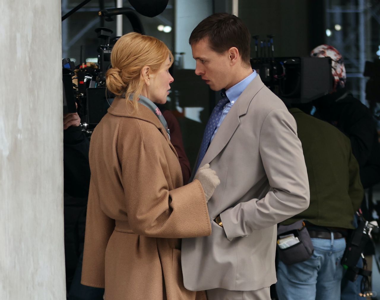 当地时间12月11日,「澳洲影后」妮可·基德曼(Nicole Kidman)和「英国新晋鲜肉小生」哈里斯·迪金森(Harris Dickinson)在曼哈顿办公大楼外拍摄新片《宝贝女孩(暂译)》。