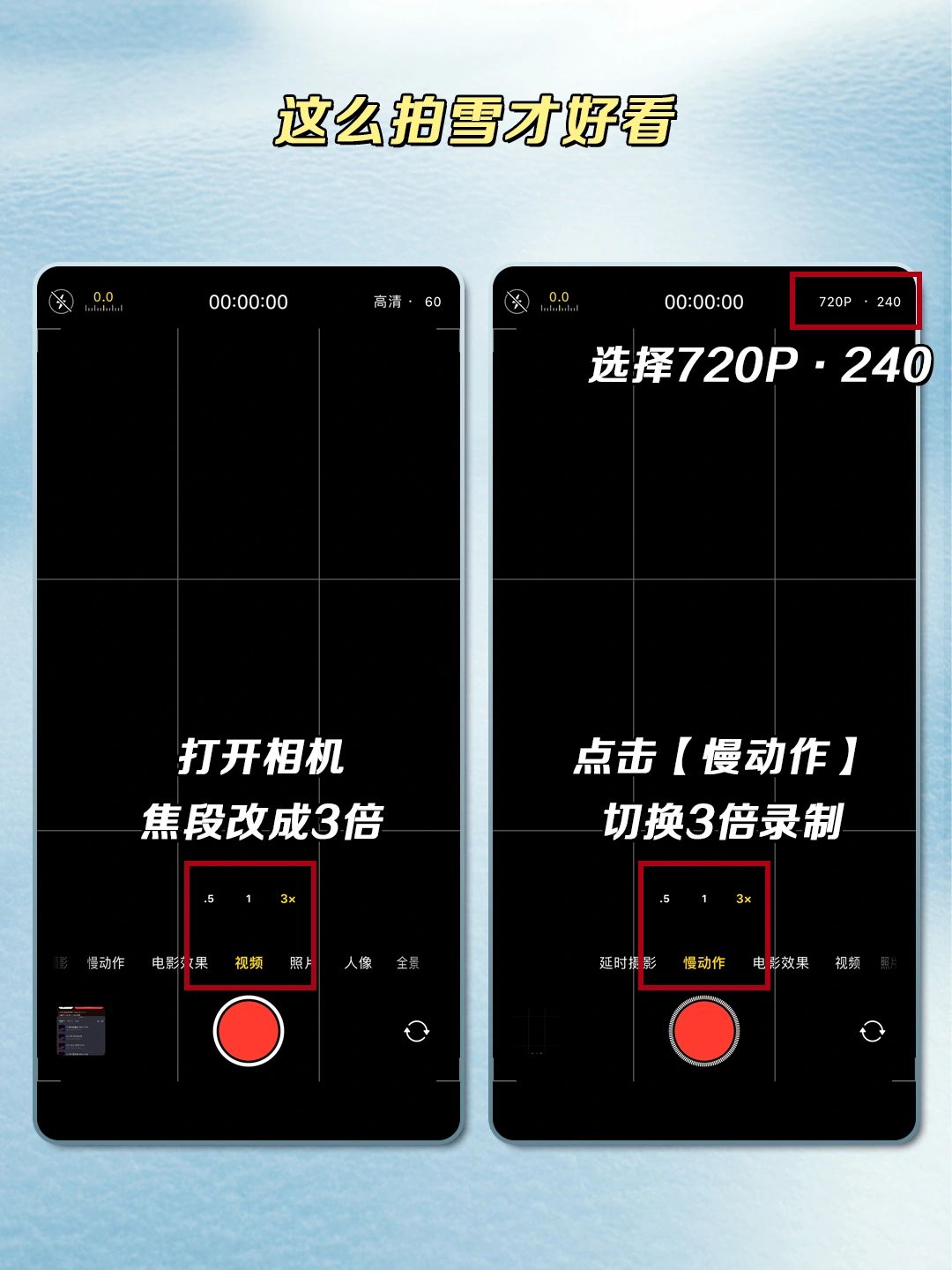相机焦段从1倍改为2倍,雪花会瞬间清晰很多~点击【慢动作】,选择高清240,切换3倍或者5倍录制