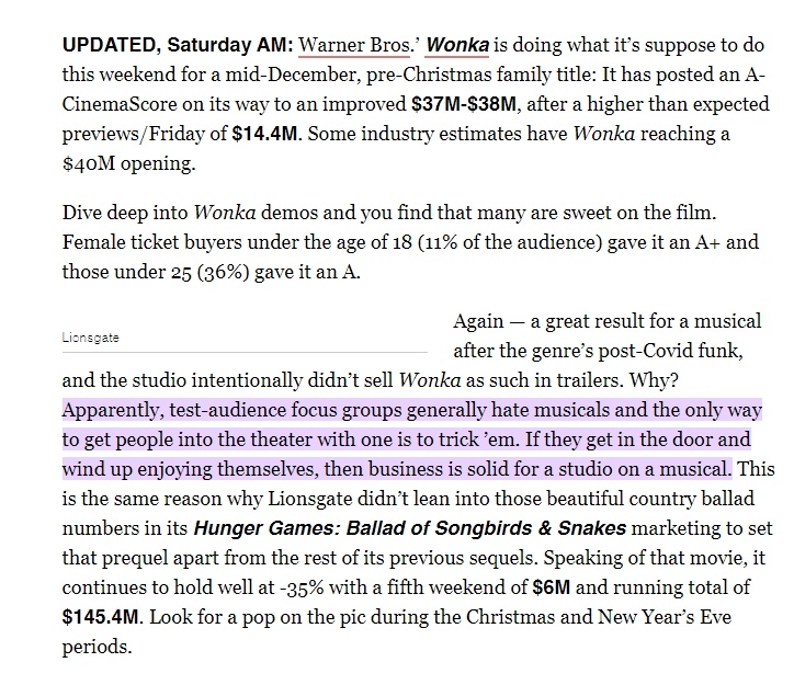 《旺卡》票房高于预期。显然,内部试映的观众们一般都讨厌音乐剧,而电影公司们让观众走进影院的唯一办法就是欺骗他们。