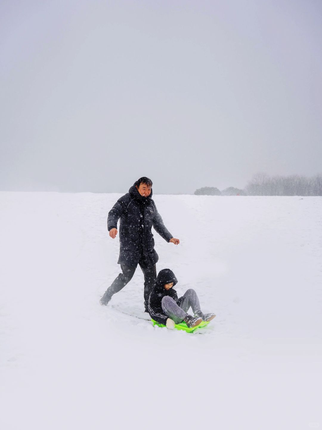 山坡成了大小朋友们的滑雪场,那棵孤独树此时此刻不孤独了~