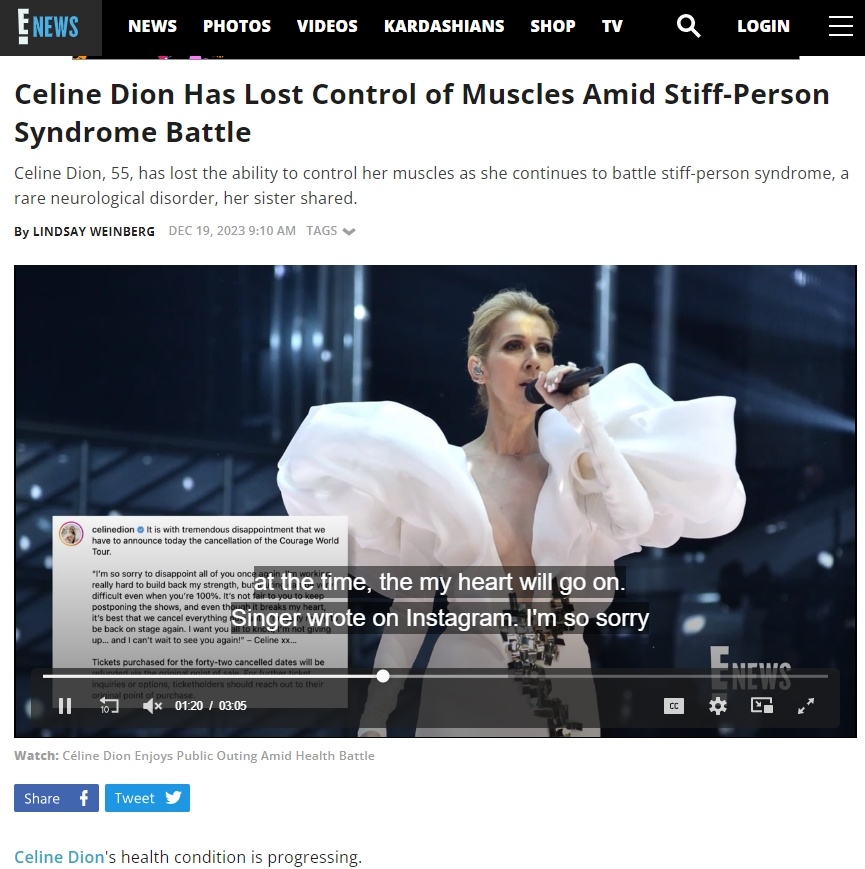 55岁的席琳迪翁(Celine Dion)一直在与僵人综合症作斗争,据她的姐姐克劳德特·迪翁(Claudette Dion)说,在她被诊断出患有僵人综合症一年后,现在她已经无法控制一些身体动作了。