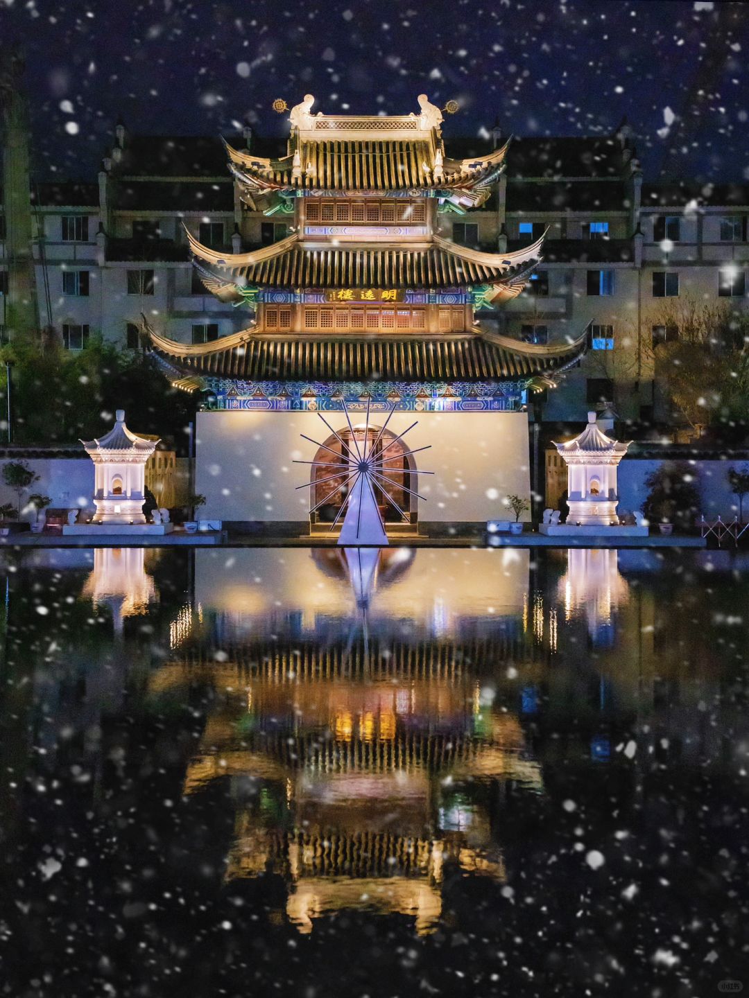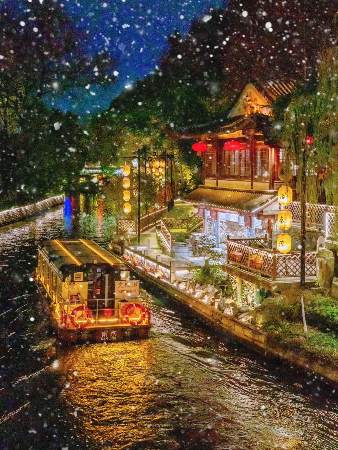 白墙灰瓦青石路,华灯点缀屋头,秦淮河水悠悠流淌,瑞雪簌簌飘落~
