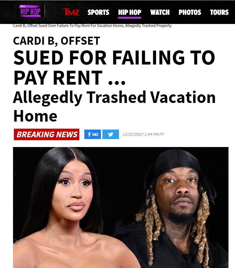正在闹分手的Cardi B和Offset夫妻俩卷入了一场租房纠纷,房主把他们告上法庭,因为他们拖欠房租并把房子弄得一片狼藉。