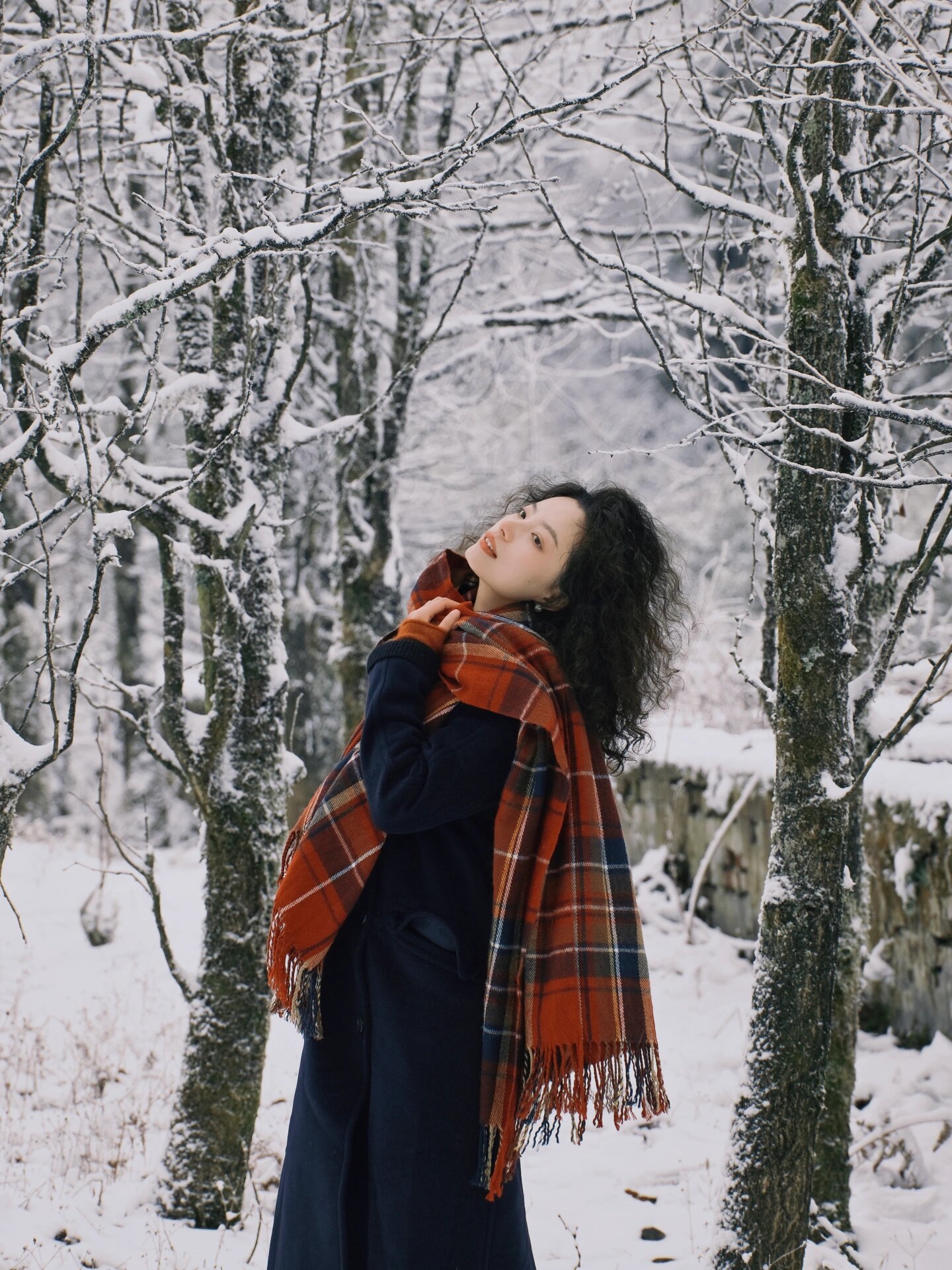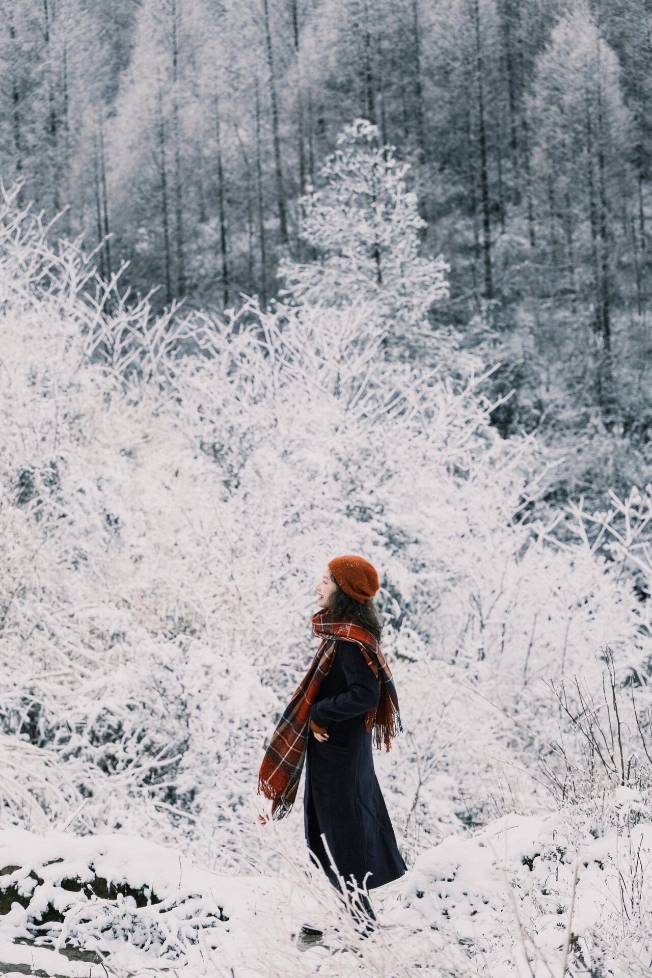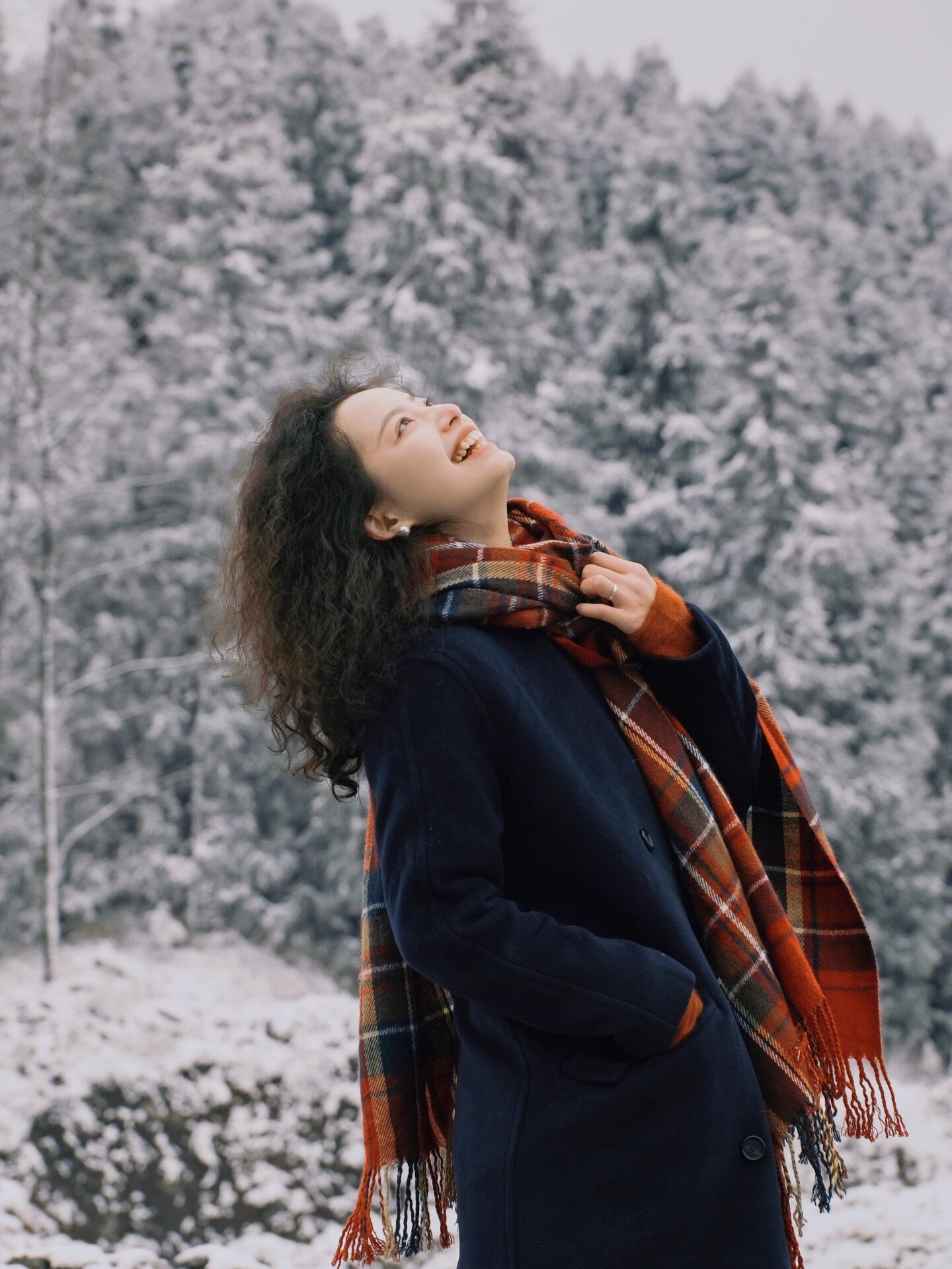 这次想拍情书同款,就搭的长大衣,带上围巾,颜色搭配的藏蓝色和红色,有几张松树的还挺有圣诞氛围的。大家用纯色大衣搭配亮眼的围巾,拍照效果都不会差的。