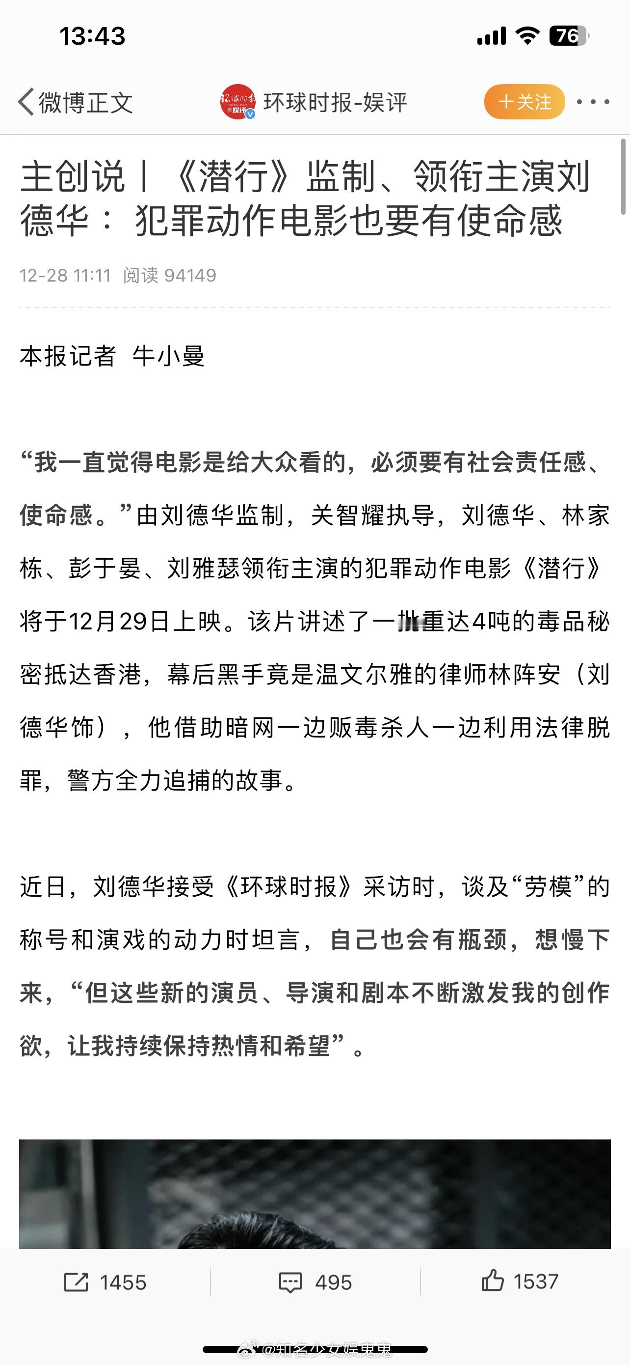 #刘德华说市场会为努力和真诚买单# 真的会被刘德华狠狠的吸粉!"一部作品传递不了正能量,我不会拍"刘德华一直保持初心用心的创作带来优秀的作品[good]很期待刘德华在这部电影里给我们带来不一样的表现,电影院不见不散!#刘德华说现在是退而不休的状态#