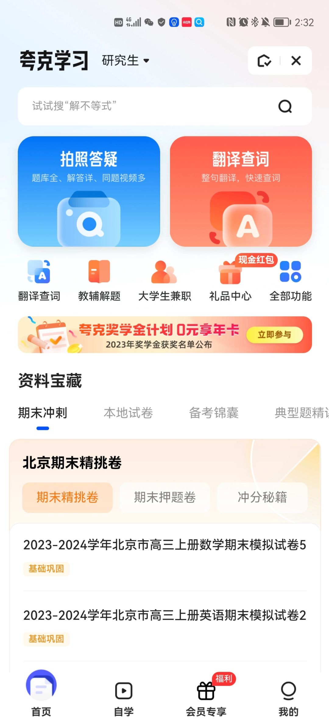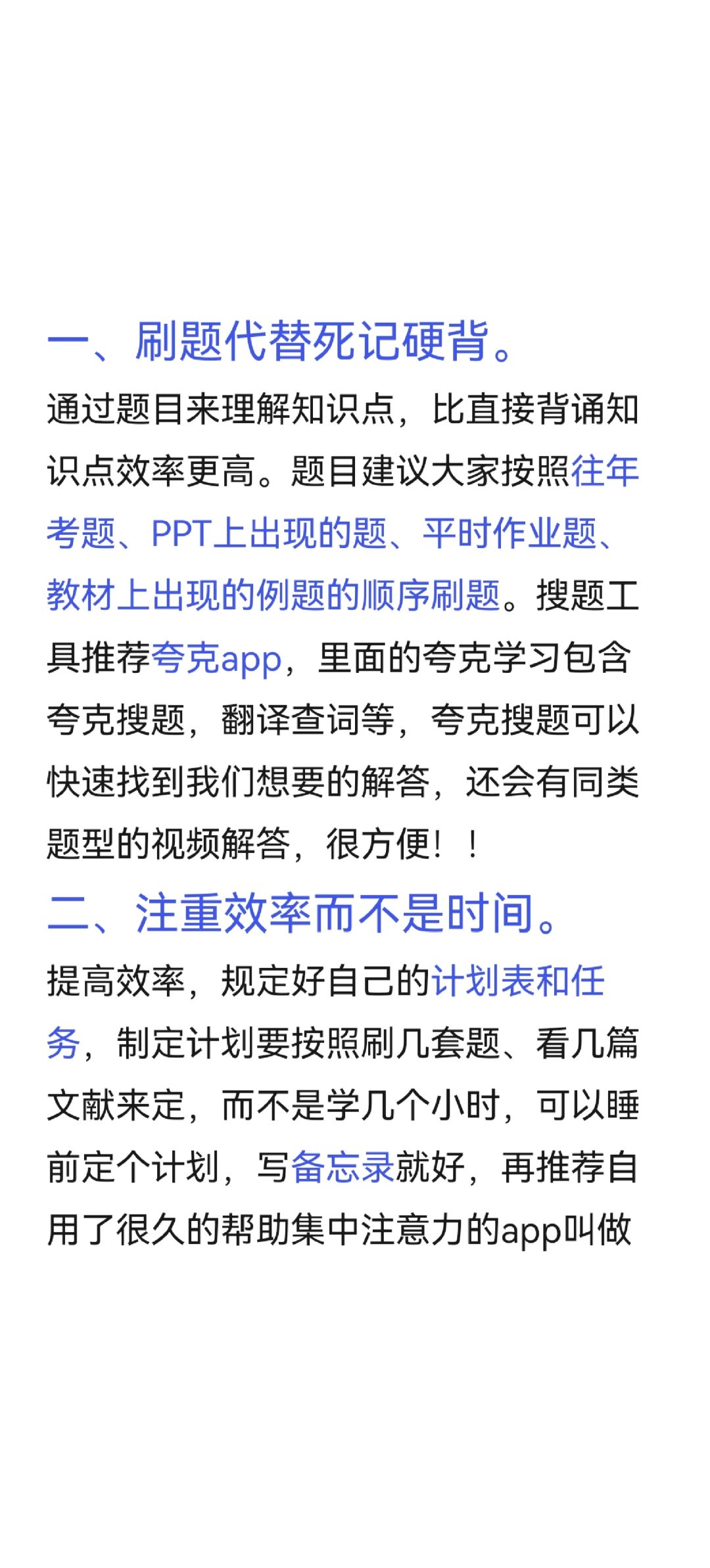 通过题目来理解知识点,比直接背诵知识点效率更高。题目建议大家按照往年考题、PPT上出现的题、平时作业题、教材上出现的例题的顺序刷题。搜题工具推荐夸克app,可以使用夸克搜索,它可以智能搜索,帮助我们快速弄懂知识点,还可以用拍照搜索,里面的广告也比较少。App中的夸克学习包含夸克搜题,翻译查词等,夸克搜题也可以快速找到我们想要的解答,还会有同类题型的视频解答,很方便!