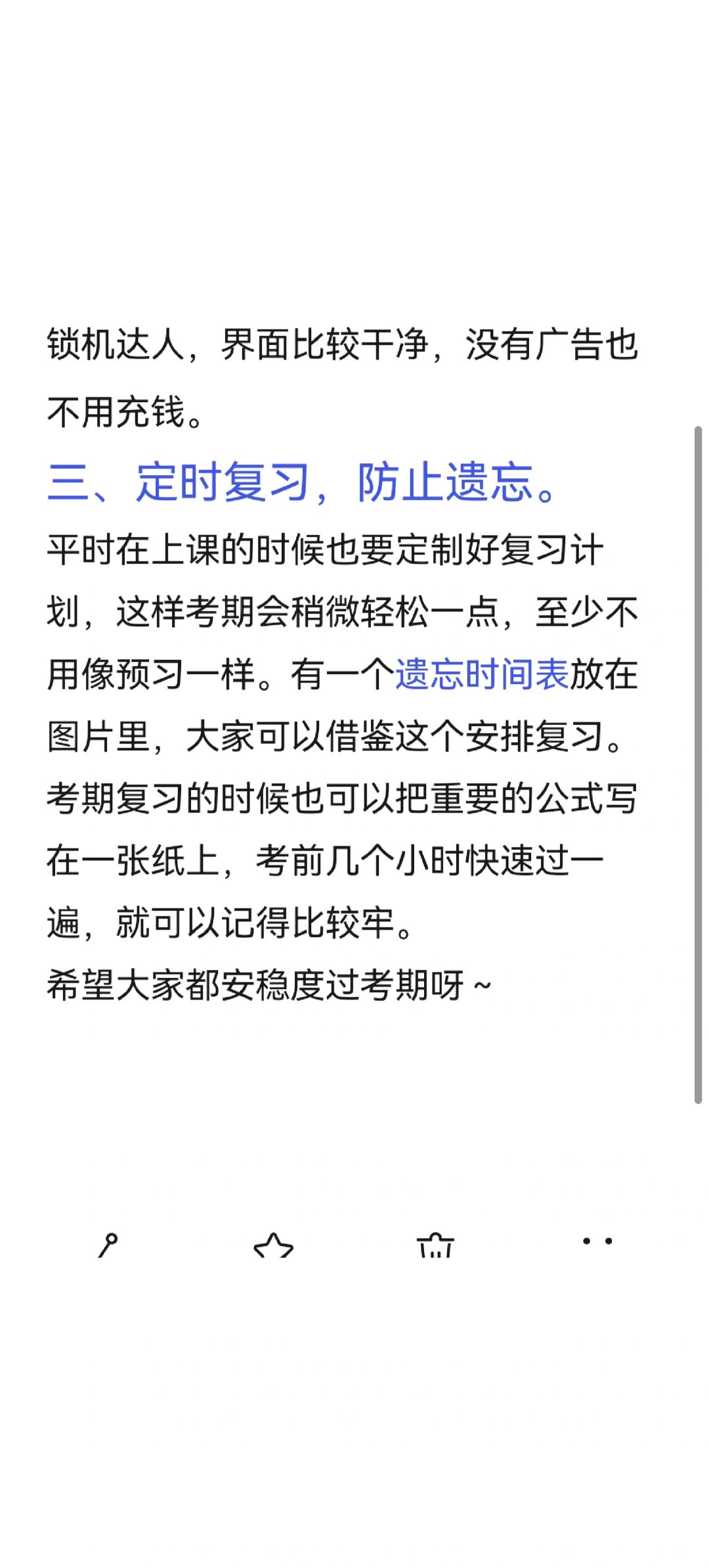 平时在上课的时候也要定制好复习计划,这样考期会稍微轻松一点,至少不用像预习一样。有一个遗忘时间表放在图片里,大家可以借鉴这个安排复习。考期复习的时候也可以把重要的公式写在一张纸上,考前几个小时快速过一遍,就可以记得比较牢。