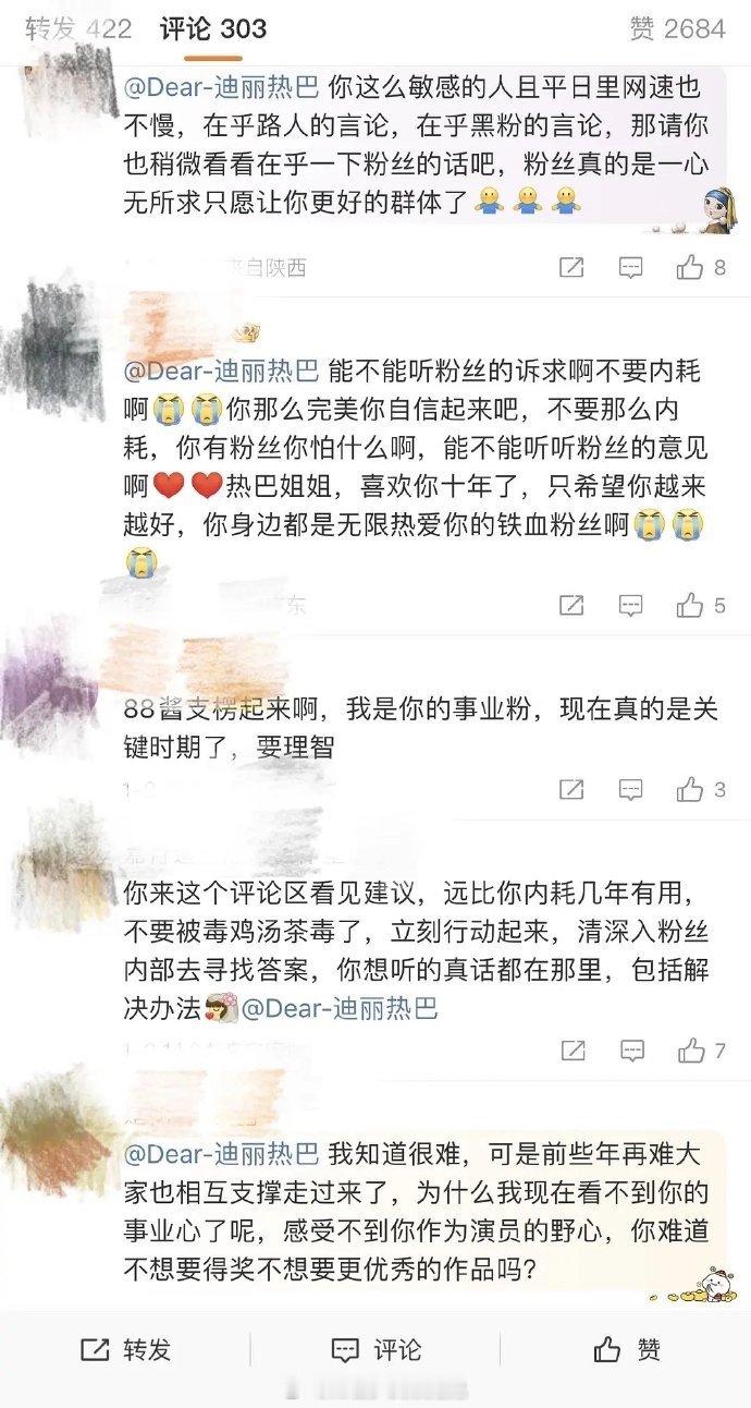 #疑似迪丽热巴粉丝发文吐槽#疑似迪丽热巴粉丝发文吐槽:粉丝认为迪丽热巴有颜值有实力,对自己的事业却把控不好,作品质量不高,对角色只生不养,让迪丽热巴对为自己考虑不要内耗,你怎么看?